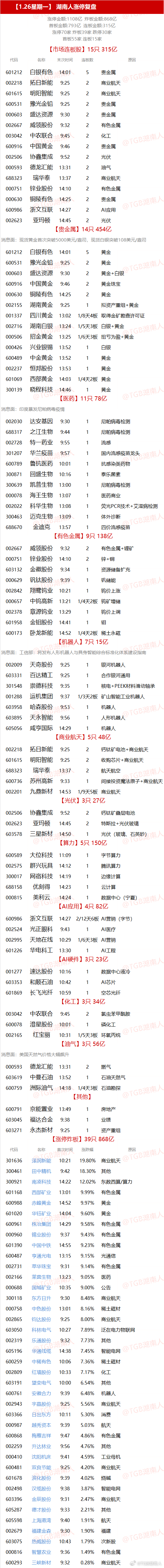【1.26星期一】 湖南人涨停复盘 "涨停金额:1108亿 炸板金额:868亿首板金额:793亿 连板金额:315亿涨停70家 炸板39家 跌停30家首板55家 连板15家" 【市场连板股】15只 315亿 代码 名称 末次时间 连板数 原因601212 白银有色 14:01 5 贵金属002218 拓日新能 9:25 2 商业航天601615 明阳智能 9:25 2 商业航天600531 豫光金铅 9:25 2 贵金属000603 盛达资源 9:30 2 贵金属002667 威领股份 9:32 2 有色金属003042 中农联合 9:45 2 化工600916 中国黄金 9:46 2 贵金属002506 协鑫集成 9:52 2 光伏000593 德龙汇能 13:31 2 油气688323 瑞华泰 13:37 2 商业航天000751 锌业股份 14:10 2 有色金属000630 铜陵有色 14:25 2 贵金属600986 浙文互联 14:27 2 AI应用002623 亚玛顿 14:45 2 光伏【贵金属】14只 454亿 消息面:现货黄金首次突破5000美元/盎司,现货白银突破108美元/盎司 601212 白银有色 14:01 5 黄金600531 豫光金铅 9:25 2 黄金000603 盛达资源 9:30 2 黄金+白银600916 中国黄金 9:46 2 黄金珠宝000630 铜陵有色 14:25 2 黄金002155 湖南黄金 9:25 1 拟资产重组+黄金001337 四川黄金 13:02 1/8天4板 取得金矿勘查许可证002716 湖南白银 13:24 1/5天3板 白银+黄金000506 招金黄金 13:25 1/6天3板 扭亏为盈+黄金000426 兴业银锡 13:52 1 白银600489 中金黄金 13:52 1 黄金002237 恒邦股份 13:53 1 黄金601069 西部黄金 14:03 1/4天2板 黄金300139 晓程科技 14:46 1 黄金【医药】11只 78亿 消息面:印度暴发尼帕病毒疫情 002030 达安基因 9:30 1 尼帕病毒检测688317 之江生物 9:44 1 尼帕病毒检测002728 特一药业 9:55 1 流感301207 华兰疫苗 9:57 1 国内流感疫苗龙头600789 鲁抗医药 10:01 1 抗感染类药物300871 回盛生物 10:16 1 泰乐菌素300639 凯普生物 13:00 1 尼帕病毒检测000078 海王生物 13:07 1 医药商业002022 科华生物 13:08 1 荧光PCR技术+艾滋病检测300463 迈克生物 13:09 1 体外诊断688670 金迪克 13:57 1 四价流感疫苗【有色金属】9只 138亿 002667 威领股份 9:32 2 有色金属+锂矿000751 锌业股份 14:10 2 锌+铜603132 金徽股份 9:34 1 资源储备扩充000629 钒钛股份 9:39 1 钒储能002842 翔鹭钨业 10:21 1 钨价上涨000657 中钨高新 13:21 1/4天2板 钨矿增储002378 章源钨业 13:29 1 钨价上调601958 金钼股份 14:41 1 钼600173 卧龙新能 14:52 1/4天2板 稀土永磁【机器人】7只 15亿 消息面:工信部:将发布人形机器人与具身智能综合标准化体系建设指南 002009 天奇股份 9:25 1 银河机器人603331 百达精工 9:25 1 合作银河通用301548 崇德科技 9:35 1 核电+PEEK材料滑动轴承001288 运机集团 9:37 1/3天2板 矿山智能工业机器人603958 哈森股份 9:53 1 机器人603895 天永智能 9:56 1 人形机器人605056 咸亨国际 14:29 1 机器人【商业航天】5只 48亿 002218 拓日新能 9:25 2 钙钛矿电池+商业航天601615 明阳智能 9:25 2 收购芯片+商业航天688323 瑞华泰 13:37 2 航天航空600736 苏州高新 9:33 1 间接投资魔法原子+商业航天002201 九鼎新材 14:53 1/9天5板 商业航天【光伏】3只 27亿 002506 协鑫集成 9:52 2 钙钛矿叠层电池002623 亚玛顿 14:45 2 特斯拉+光伏玻璃603578 三星新材 14:50 1 光伏(玻璃、石英砂)【算力】5只 150亿 600589 大位科技 11:09 1 字节算力002575 群兴玩具 14:12 1 腾讯算力300017 网宿科技 14:19 1 边缘计算688158 优刻得 14:23 1 云计算000815 美利云 14:24 1 数据中心(宁夏)【AI应用】4只 82亿 600986 浙文互联 14:27 2/12天6板 AI营销(字节)002524 光正眼科 9:43 1 AI医疗002995 天地在线 10:29 1/6天3板 AI营销601226 华电科工 13:30 1 AI工程【AI硬件】3只 23亿 001277 速达股份 10:16 1 数据中心液冷603353 和顺石油 10:42 1 AI芯片601869 长飞光纤 10:59 1 空芯光纤【化工】3只 34亿 003042 中农联合 9:45 2 氯虫苯甲酰胺600078 澄星股份 10:01 1 磷化工002165 红宝丽 10:31 1/5天3板 环氧丙烷【油气】3只 56亿 消息面:美国天然气价格大幅飙升 000593 德龙汇能 13:31 2 燃气603619 中曼石油 13:52 1 石油天然气600759 洲际油气 14:18 1/4天3板 石油勘探【其他】 600791 京能置业 13:49 1 房地产603045 福达合金 9:38 1 业绩603271 永杰新材 9:25 1 资产重组【涨停炸板】39只 868亿 代码 名称 首次时间 涨跌幅 原因301636 泽润新能 10:21 19.80% 商业航天300461 田中精机 9:42 18.30% 其他300921 南凌科技 14:22 12.02% 东数西算/算力601168 西部矿业 13:01 9.99% 有色金属600988 赤峰黄金 14:52 9.97% 黄金601020 华钰矿业 14:04 9.60% 黄金600961 株冶集团 14:29 9.58% 有色金属000960 锡业股份 9:37 9.43% 有色金属601390 中国中铁 14:55 9.23% 有色金属600487 亨通光电 13:15 9.15% 光通信002731 萃华珠宝 9:31 9.14% 有色金属002166 莱茵生物 13:23 9.05% 医药000688 国城矿业 10:35 9.00% 公告300118 东方日升 9:30 8.48% 商业航天000758 中色股份 13:01 8.16% 稀土磁材002865 钧达股份 9:25 8.00% 商业航天603050 科林电气 10:27 7.89% 泛在电力物联网002319 乐通股份 9:32 7.73% 其他605196 华通线缆 14:38 7.45% 智能电网600259 中稀有色 10:06 7.36% 稀土磁材002809 红墙股份 10:33 7.17% 化工603191 望变电气 10:00 6.54% 其他600761 安徽合力 9:39 6.48% 机器人002943 宇晶股份 9:25 5.56% 商业航天603366 日出东方 10:11 5.30% 消费000987 越秀资本 9:39 5.03% 航天600868 梅雁吉祥 9:47 4.86% 有色金属002259 升达林业 9:56 4.76% 其他000410 沈阳机床 9:41 4.59% 工业母机600481 双良节能 9:25 4.20% 商业航天601678 滨化股份 9:39 4.02% 烧碱002498 汉缆股份 9:38 3.87% 智能电网603396 金辰股份 9:31 2.47% 商业航天605287 德才股份 9:33 2.21% 其他605598 上海港湾 9:40 1.91% 航天002679 福建金森 9:30 1.90% 福建603075 热威股份 10:43 1.79% 次新股000816 智慧农业