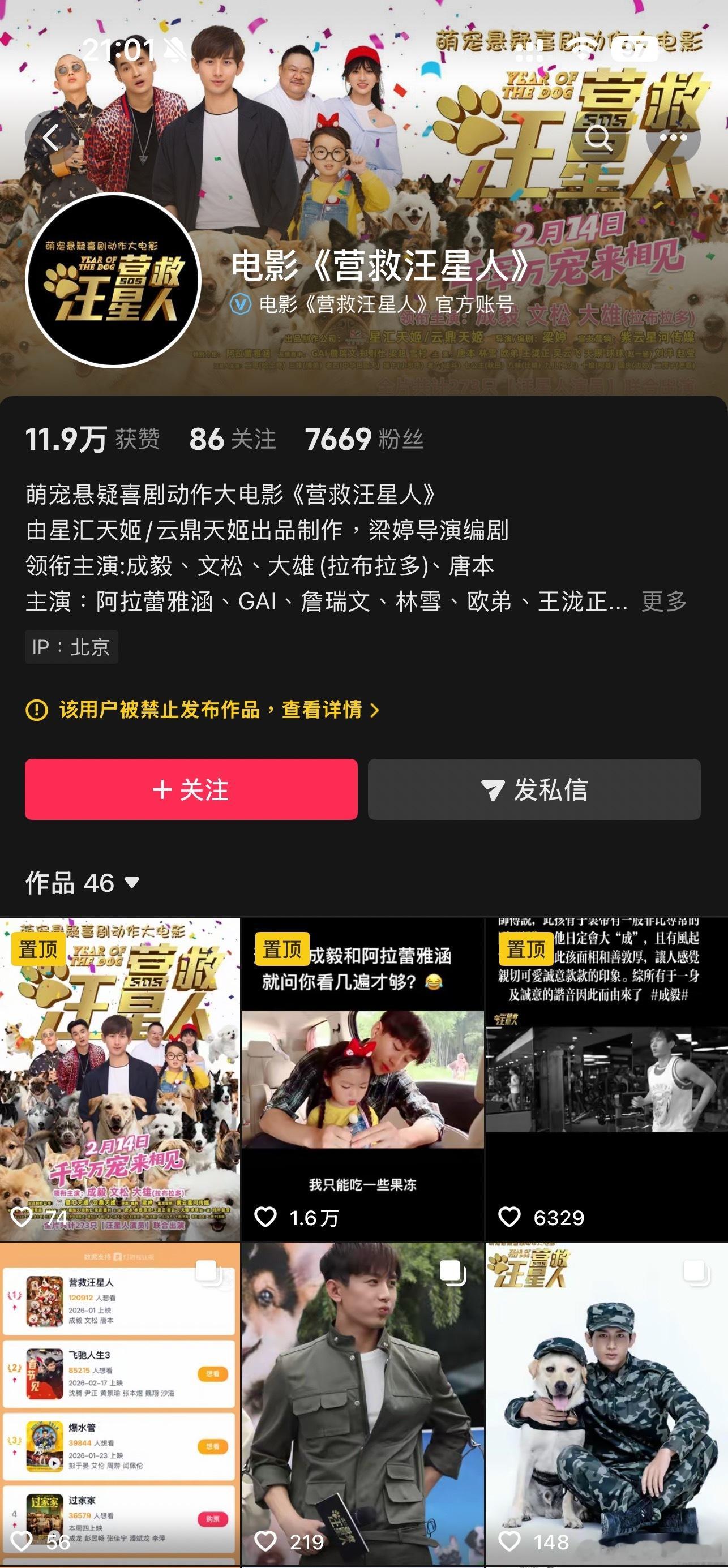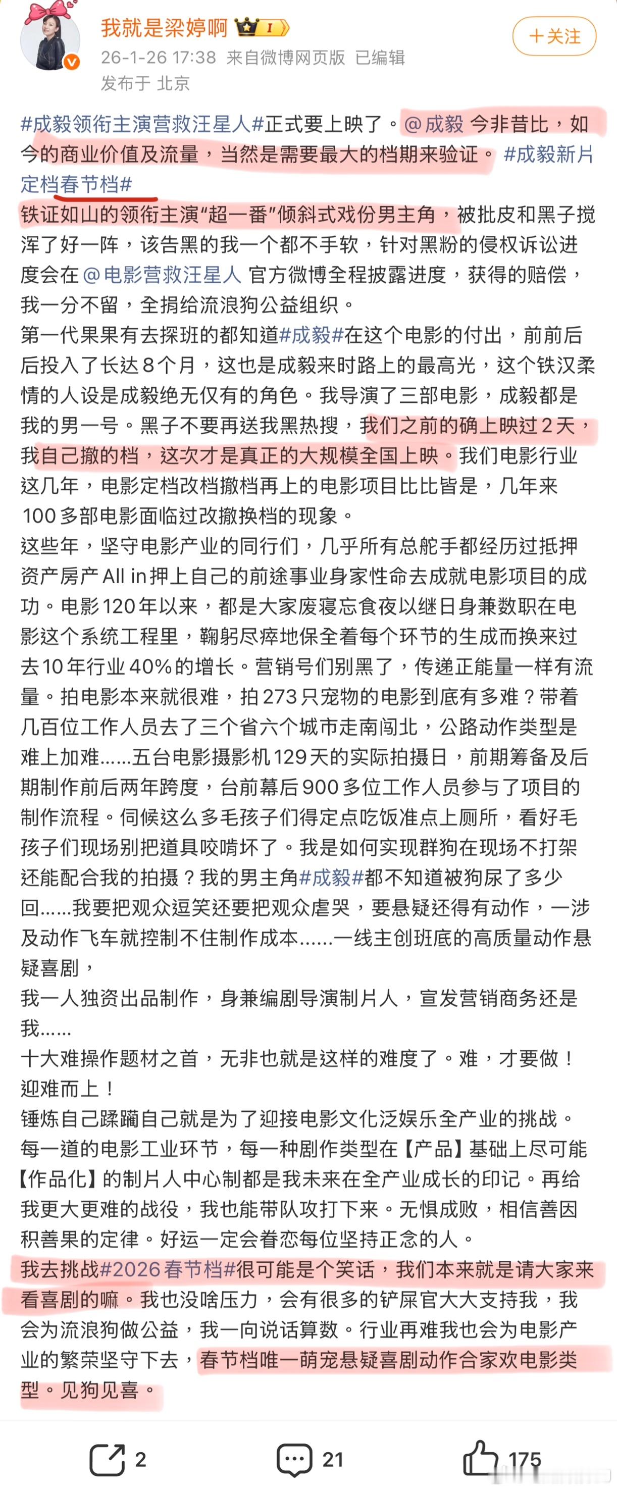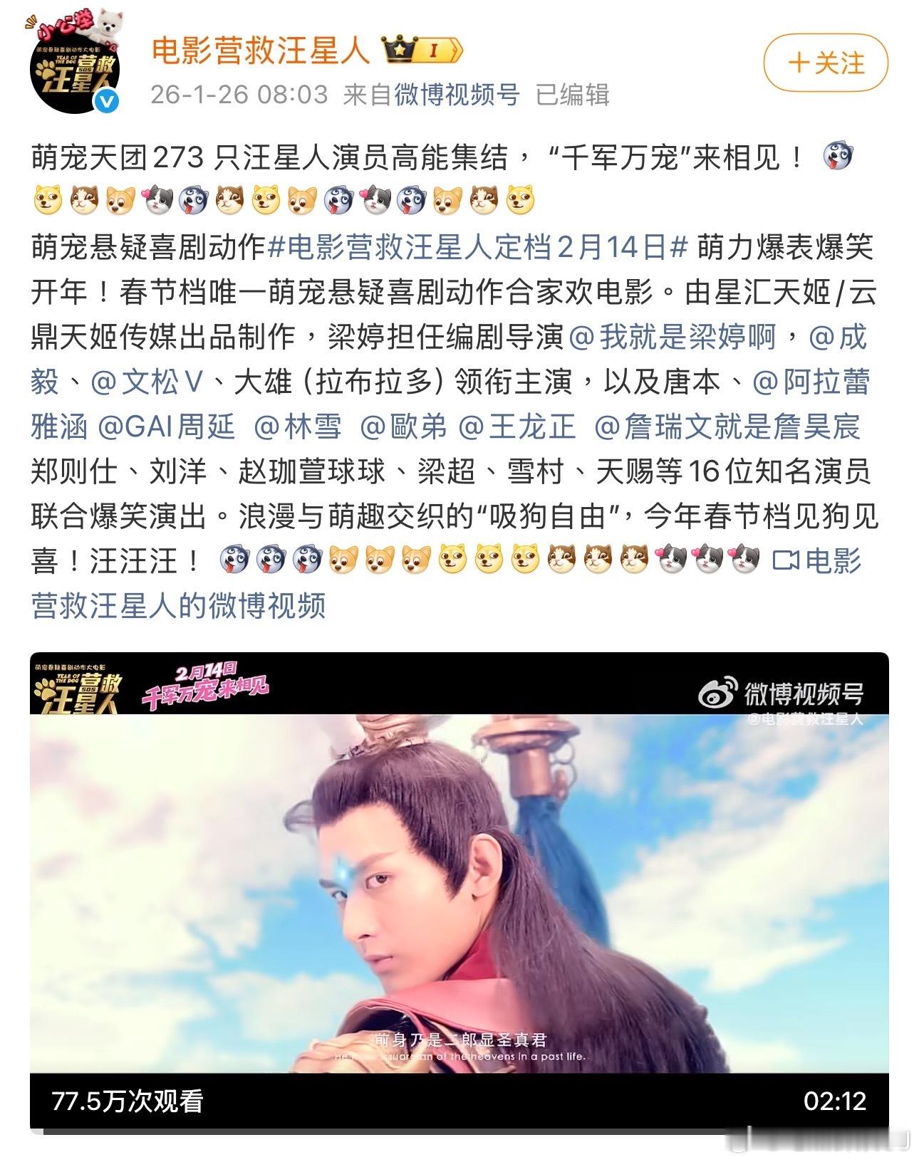 成毅旧作《营救汪星人》宣布定档2.14,进驻春节档,前老板+资方+编+导总之集各种身份于一身的梁婷说这就是征战春节档了,因为“成毅今非昔比,如今的商业价值及流量,当然是需要最大的档期来验证”。但电影2017年拍的,2018年就勇闯过春节档,后来又上过18年国庆档然后很快撤档,居然现在还要上26年情人节档期。而且微博一片火热,电影官抖却被禁止关注,而且也只允许关注的人评论,实在看不明白片方到底是什么路数。