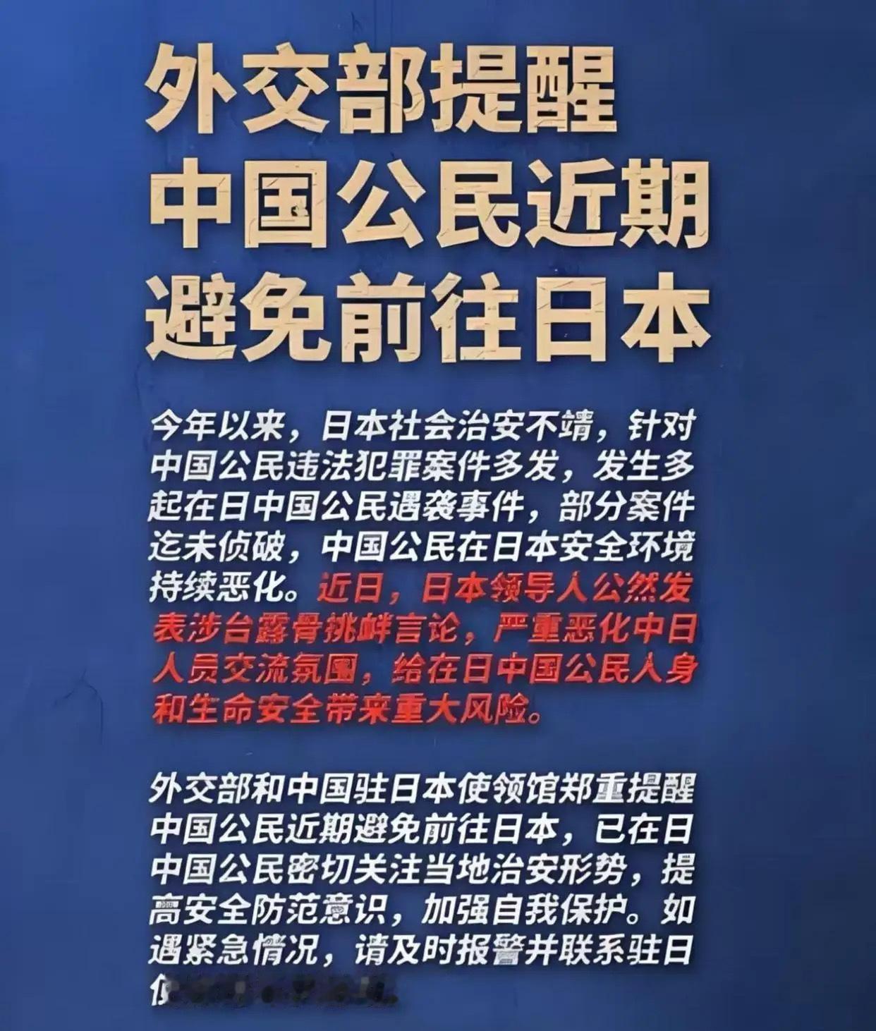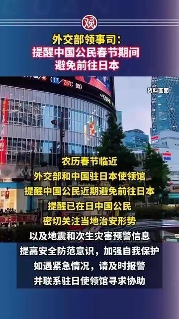 外交部紧急提醒:这个春节别去日本!背后的双重风险,每个家庭都该看清 “刚退了初二飞东京的机票,损失几千手续费也认了!”外交部1月26日傍晚的赴日安全提醒一出,社交平台上满是这样的留言。原本计划带着父母孩子赴日赏雪、逛庙会的家庭,纷纷调转方向选择国内游——这不是跟风,而是读懂了官方“避免前往”背后的良苦用心。 很多人没意识到,这则看似简单的提醒藏着普通人无法承受的双重风险。一边是社会治安的持续恶化:跨年夜东京新宿的汽车撞人案中,两名中国公民重伤住院;大阪、北海道接连发生针对同胞的抢劫、围殴事件,更让人揪心的是,这类案件的侦破率不足5%,遭遇侵害后维权难如登天。语言不通、环境陌生春节出游本是图个热闹,谁想变成提心吊胆的“冒险”? 另一边是天灾的步步紧逼。作为地震频发国,日本近期地震活跃度飙升,石川县能登半岛刚发生4.6级地震,海啸预警同步拉响,房屋开裂、道路塌陷的画面触目惊心。更可怕的是基础设施的短板:无栏杆的简易道口事故率是普通道口的3倍多,不久前就有中国游客在网红打卡点被列车撞倒身亡。春节期间本就人潮拥挤,再叠加暴风雪等恶劣天气出行安全更是无从保障。 有人说“签证费都涨了5倍,本来也去不起”,但这从来不是钱的问题。外交部的提醒,从来不是“禁止”,而是把风险摆到明面上,让每个家庭能做出最稳妥的选择。就像网友说的:“海南的阳光云南的雪景,哪样不比异国他乡的风险香?” 平安,才是春节最美的底色。 这场“出行转向”,藏着国人越来越清醒的认知:旅游的本质是放松,而非冒险家人的团聚,容不得一丝侥幸。官方的及时发声,是最坚实的后盾;我们的理性选择,是对自己和家人最负责的守护这个春节,与其冒着风险远赴他乡,不如在国内寻一处安心地,陪父母唠唠嗑带孩子看看风景——这样的团圆,才更有温度。 你有没有取消过境外行程?你心中的春节最优出行地是哪里?欢迎在评论区聊聊!