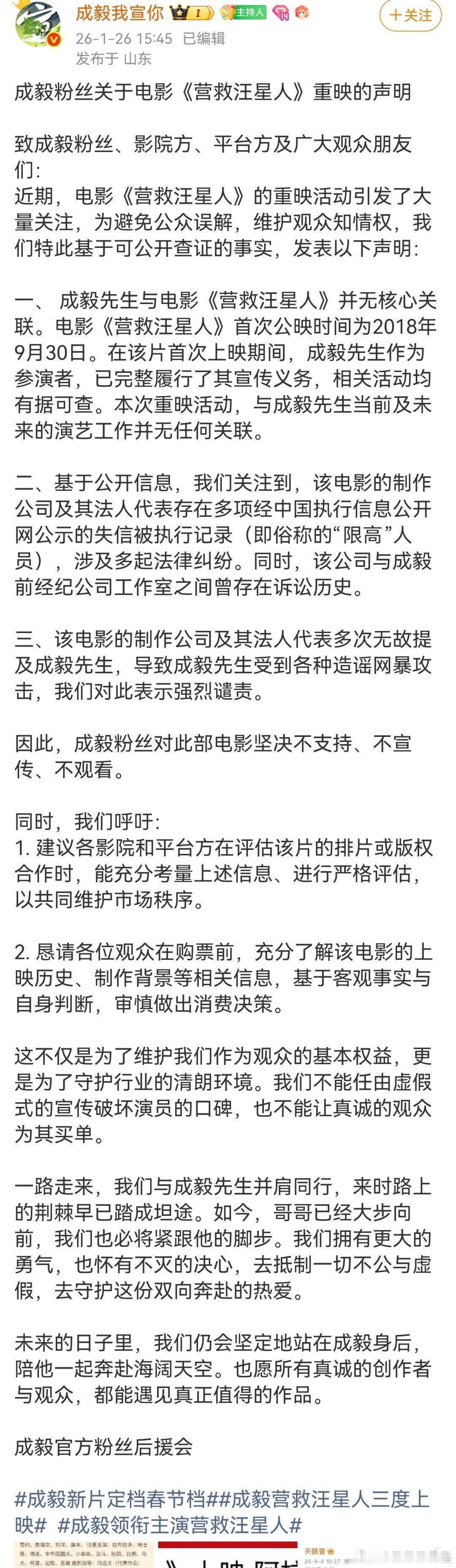这个后援会发声是老の的意思吧原来当初梁女士赢了官司,老の赔了不少钱,难怪对这部电影不爽。