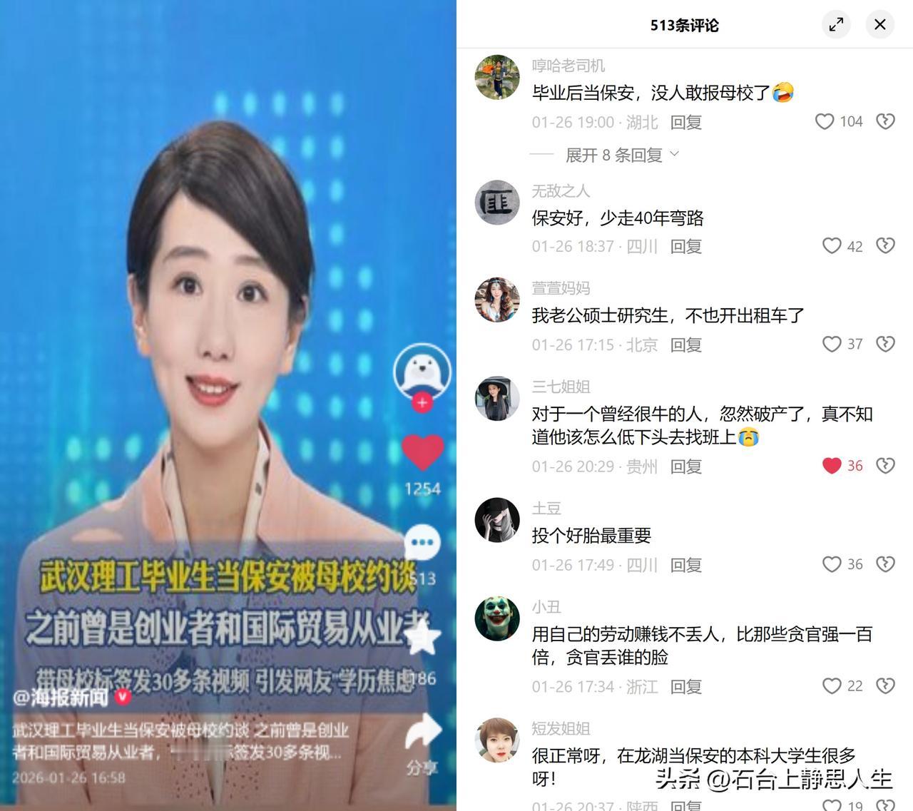 从创业者到保安,名校生的选择刺痛了谁? 一位08届名校毕业生,做过十多年国际贸易还创过业,如今转行当保安,因带母校标签发视频引关注,校方约谈称是关心,舆论吵翻了。 这事儿核心不在于丢不丢母校的脸,它真正击中了太多成年人的生存痛点。我们总被灌输学历必须配体面职业,名校毕业就得搞科研、当高管,不然就是浪费资源、高开低走。可现实是,创业有风险,行业有起伏,没几个人能一路顺风顺水。 有人提到硕士开出租、本科当保安,这些早已不是个例。当生存压力摆在面前,能放下身段找份踏实的活,更多的是勇气,算不得落魄。真正该反思的,是这种把职业分三六九等的刻板偏见。 劳动本无贵贱,却被世俗的尺子量来量去,逼得人连选自己的路都要被指指点点。人生哪有什么标准答案?靠双手吃饭,就没什么丢人的。你怎么看?
