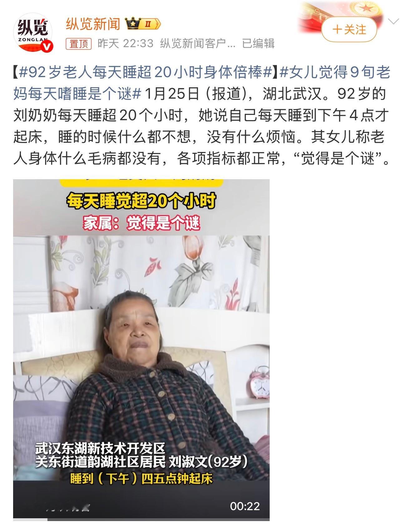 92岁老人每天睡超20小时身体倍棒每天睡20小时,下午4点才起床,这是怎么做到的?睡眠质量太好了!这要是搁古装剧里绝对是世外高人!