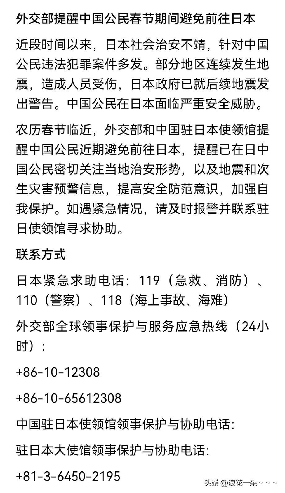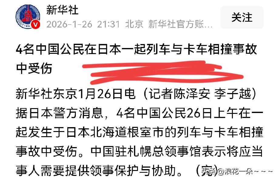 突发!快讯! 4名中国公民在日本一起列车与卡车相撞事故中受伤!虽然这是一些交通事故,但是,我看了后第一反应是想到了,刚刚看到外交部提醒大家春节期间避免前往日本的事! 这起交通事故也侧面说明了日本确实不太安全。希望在日本的中国人一定要注意安全啊,同时,想去日本的仔细考虑考虑再说吧,上面把话说的都这么明白了,都是对大家好啊。[玫瑰]