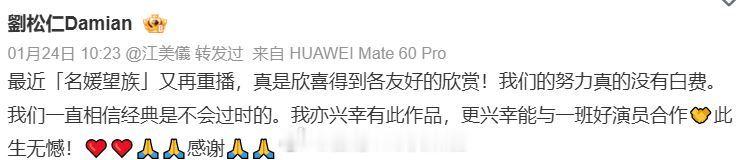 星岛:刘松仁叹此生无憾 心系《名媛望族》深信经典不会过时 淡出幕前随心而行真实状态惹人牵挂由刘松仁、杨怡(杨茜尧)、陈玉莲、马国明、吴卓羲、江美仪、王浩信和韩马利主演的TVB台庆剧《名媛望族》虽然是13年前的作品,但至今仍然是不少人的集体回忆,近日在剧中饰演三姨太“易懿芳”江美仪完美演绎以英语与刘松仁的对骂,被网民疯狂洗版。刘松仁能与一班好演员合作此生无憾刘松仁近年因要专注“服务身体”而淡出幕前,鲜有露面的刘松仁仍然活跃社交平台,对于剧集再被观众关注,他在微博留言:“最近《名媛望族》又再重播,真是欣喜得到各友好的欣赏!我们的努力真的没有白费。我们一直相信经典是不会过时的。我亦庆幸有此作品,更庆幸能与一班好演员合作,此生无憾!感谢。”刘松仁赞“大姐”韩马利的演出江美仪近日因在《名媛望族》饰“易懿芳”不满“钟卓万”刘松仁娶戏子出身的“康子君”杨茜尧入门,其家底不符合钟家媳妇嘅要求:“我们三位太太都是名门望族,大姐书香世代,二姐前清格格,我阿爸是银行家,你要娶个戏子做四姨太,你不用旨意啊!”“钟卓万”刘松仁以英文闹三太江美仪不要呼呼喝喝,“易懿芳”江美仪即瞪大眼连续说出三句英文对白:“I don't give a damn!”、“I'll shout as I please!”、“As if I care!”张力十足地还击刘松仁,想不到这一幕多年后竟被网民疯狂洗版。淡出幕前多年的刘松仁原来亦有留意事件,连日来在微博发文,刘松仁大赞韩马利的演出:“其实整个剧最难演的是‘大姐’,演员能够在没有多大的事件和冲突戏的同时,一直都保持大太太这个角色的内敛含蓄而不外露。演员仍然能守住自己的岗位,不失她大太太的风范、优雅和气质是谈何容易!多谢MARY姐你的演出,才能维系了整个1家庭的和谐。演戏的功力真不是一朝一夕的,需要时间的沉淀,加上努力,才能形成了你今天的气质,你的演艺事业成就~值得欣慰!庆幸我们在70年代就已经合作、认识、结缘。永远祝福你! ”夏竹欣多谢刘松仁真诚分享获益良多曾经与刘松仁合作的夏竹欣昨日(25日)在IG贴上多张的合照并说:“每次同松哥倾偈都一定获益良多,无论对做人做事都是有大大的帮助,多谢你的真诚分享,所以我真是好着数,次次都有嘢袋走,感恩有你。望住松哥不停都諗起晚晚追紧的《名媛望族》里面的钟卓万、钟家老爷、钟先生,真是做得好好,好好睇,劲型。我同松哥都有唯一的同场㗎,当然听松哥再讲多啲、了解多啲套剧就觉得更加好睇,更加精彩刘松仁感恩谦卑缘分珍惜生命影响生命钟卓万玛利修女。”相中的刘松仁全程笑容满面,头上的银丝消失不见,看起来脸色红润,精神状态明显不俗。目前刘松仁的生活很随心而行:“我没界定要做什么事,就如大家常说‘出山’,我觉得应该不可能,因为精力已经有限,时间有限,我知道自己的能力。我很喜欢现阶段的我,不强求什么,一切随环境随心而行。”