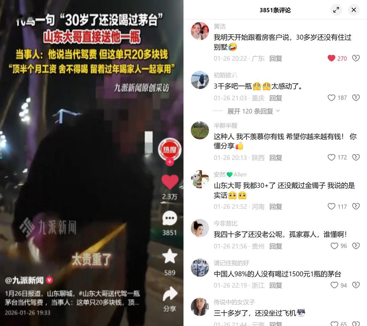 代驾随口说没喝过茅台,山东大哥直接送了一瓶! 聊城的袁师傅做代驾时,挠着头自嘲30岁还没喝过茅台,语气松松的像在说件小事。车主突然顿了顿,摸了摸后座的酒盒,抬头眼睛发亮,硬把茅台塞给他抵20元的代驾费。 袁师傅搓着手推让,车主拍着他胳膊说拿着,我听着难受。他抱着酒瓶往家走,一路摸了三次瓶身,赶紧给老婆发语音:过年能喝上茅台了! 这年月大家都算投入产出,值不值得挂嘴边。可这种听见无心感慨就掏心的共情,才是真奢侈品。成年人最缺的糖,未必是名贵的酒,更在于有人在意你没说出口的小遗憾。 就像冬天喝了杯热奶茶,甜得踏实又珍惜。你有没有被这种细碎的善意暖到过?