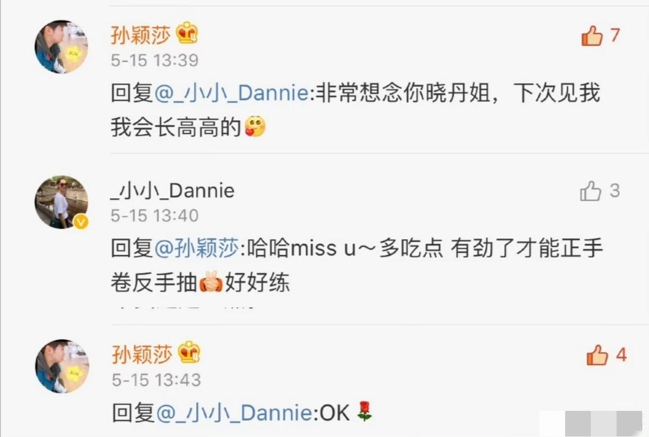 这样的莎莎甜齁了! 莎莎:“宁姐,送你朵花。” 丁宁:“我不吃这套,等你回来。” 莎莎:“好,等着,卖萌” 丁宁:“别给我卖萌。” 莎莎:“想我了吗?我很想你。” 莎莎:“瑞哥,有没有想我。” 莎莎:“非常想念你晓丹姐,下次见我会长高高的 。” 晓丹:“多吃点,有劲了才能正手卷反手抽。” 莎莎:“OK,送花!” 早起的莎莎真是各种撩拨,这甜齁的,谁能受得了。据说还让队医小姐姐叫她“小宝贝”,多可爱啊。
