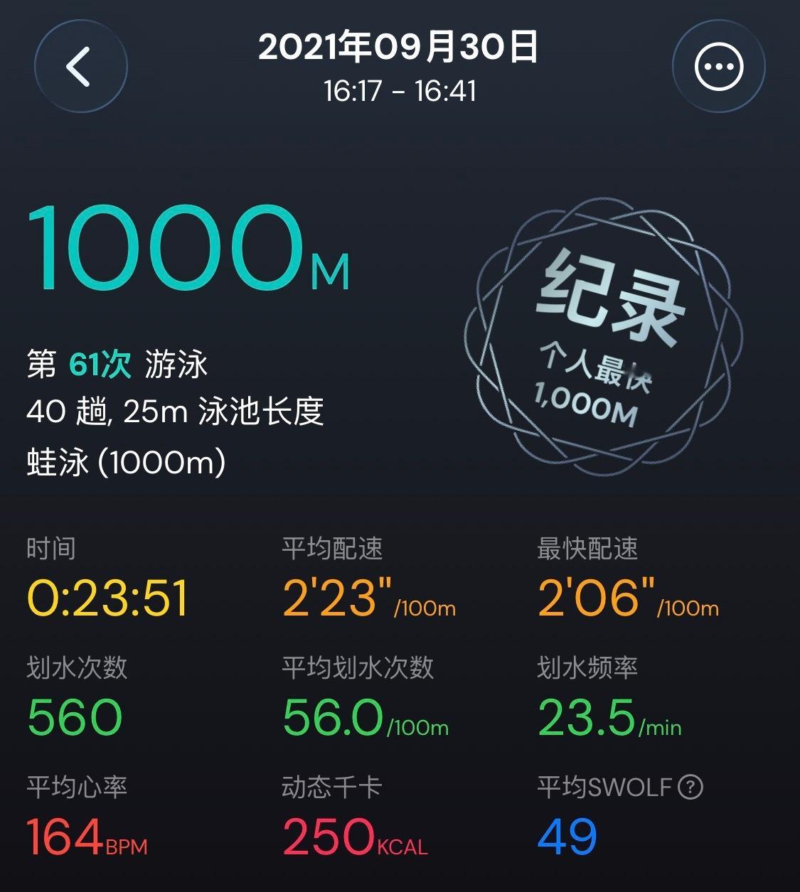 越来越快了近半年1000米用时进步了2分钟距离个人曾经的最快速度,还剩最后11秒24分02→23分51秒继续努力,追上2021年的自己