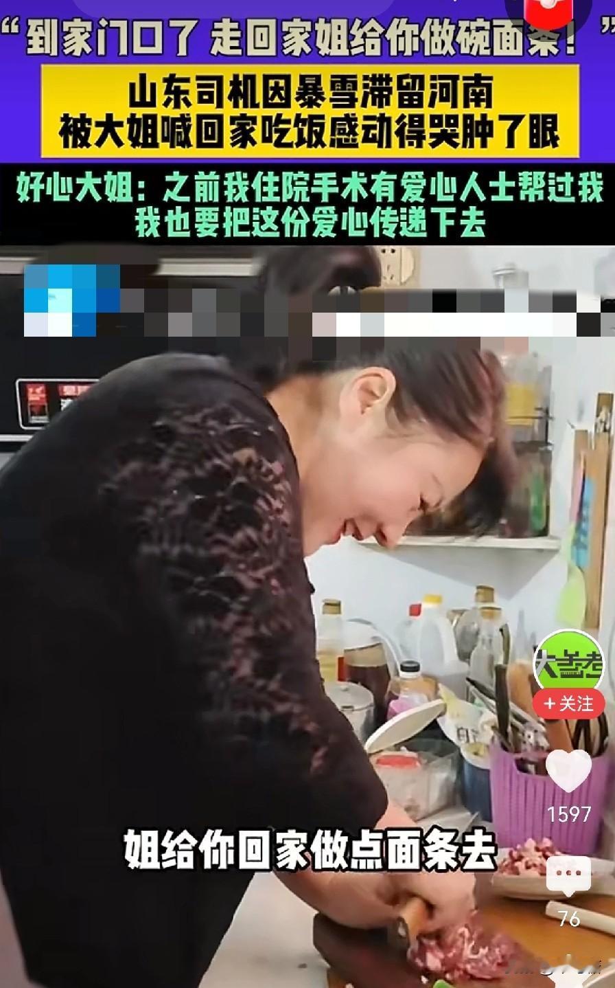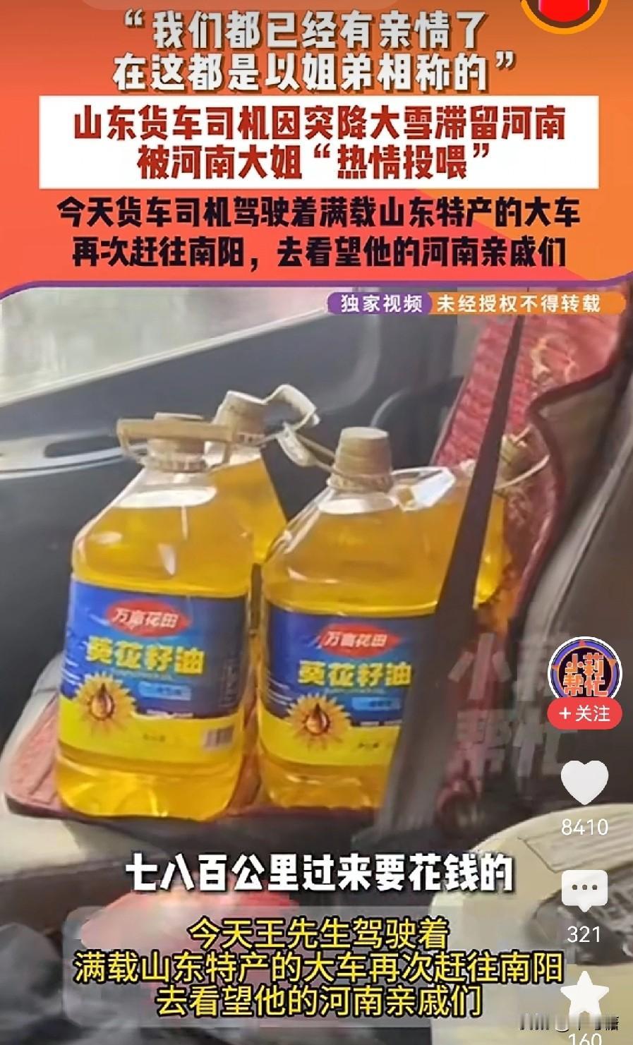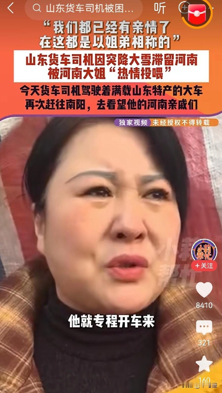 “河南人真中啊”,这是山东德州卡车司机哭着拍着视频,感谢被“投喂”。做卡车司机八年,第一次被热心的几位姐姐喊回家吃饭。他从没想过,一次寻常的滞留,会被一碗热饭、一份陌生的善意,暖透了心底。 一月的雪裹着寒风,路面结了冰,王大哥的鲁牌卡车只能停在路边,前不着村后不着店,他索性窝在驾驶室里,就着凉水啃干粮,心里盘算着雪啥时候能停,货啥时候能送。驾驶室里的温度越来越低,可比温度更凉的,是出门在外孤身一人的漂泊感。他以为这场滞留,不过是八年运输生涯里再普通不过的小插曲,却没想到,一阵轻轻的敲门声,打破了这份冷清。 敲车门的是一位当地的河南大姐,嗓门爽朗,笑容憨厚,张口就是地道的河南话:“大兄弟,别在车里冻着了,上家里吃口热乎饭吧!”王大哥愣了神,第一反应是推辞,素不相识,怎么好意思麻烦人家。可大姐不由分说,拉着他的胳膊就往旁边的家里走,嘴里还念叨着:“出门在外都不容易,一碗饭而已,没啥客气的。” 推开门,一股饭菜的热气扑面而来,驱散了王大哥身上的寒气。桌上摆着热腾腾的烩菜、刚蒸好的馒头,还有一碗冒着热气的米汤,都是最家常的河南味道,却比山珍海味更熨帖。 捧着温热的饭碗,吃着满口的家常味,王大哥的眼眶一下子就湿了。八年跑运输,他遇过堵车的焦虑、卸货的辛苦,也尝过孤身在外的心酸,却很少被这样毫无保留的善意包裹。陌生人的一碗热饭,不仅暖了胃,更暖了他这个异乡人漂泊的心。他反复说着谢谢,大姐却摆摆手:“家里也有跑货车的人,懂。” 如今这件事的后续,更让这份善意有了温暖的回响。王大哥的经历被网友知晓后,大家纷纷为河南大姐的热心肠点赞,有人说“这是最朴实的善意,最动人的温暖”。而王大哥在雪停后,特意买了礼品去感谢大姐,两人也成了常联系的朋友。他说,这次的经历,让他记住了南阳的雪,更记住了南阳人的暖,往后跑运输再经过河南,心里总觉得格外亲切。一碗热饭,看似平常,却藏着中国人最朴素的善意。大家出门在外有被感动的瞬间吗?