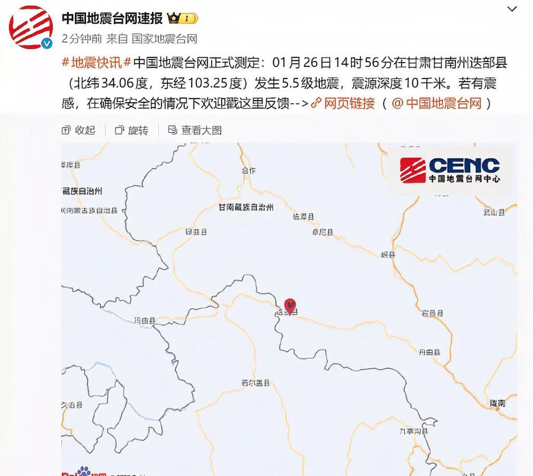 1月26日,甘肃甘南州迭部县发生5.5级地震,引发广泛关注。震中地区是否安然无恙?房屋受损情况如何? 1月26日14时56分,甘肃甘南州迭部县发生了5.5级地震,震源深度10千米。据中国地震台网测定,此次地震震中位于北纬34.06度,东经103.25度,距离迭部县城中心仅2.8公里。地震发生后,甘南州启动了地震灾害应急三级响应。幸运的是,经过初步排查,截至目前未收到人员伤亡报告。然而,震中附近迭部县的房屋受到了不同程度的影响,电尕镇的7个行政村中有49个自然村震感强烈,其中更古、恰告、电尕3个村和城东、城西2个社区的部分土墙房屋出现了裂缝和砖瓦掉落的情况。此外,迭部县敬老院、综合养老服务中心人员均已安全撤离,公安部门也迅速出动警力350人进行搜救和秩序维护。地震发生后,甘肃省消防救援总队紧急调集了65辆车、340人、7犬参与救援,确保了震区的安全和稳定。目前,迭部县正在全力组织人员疏散和受损情况的进一步调查。