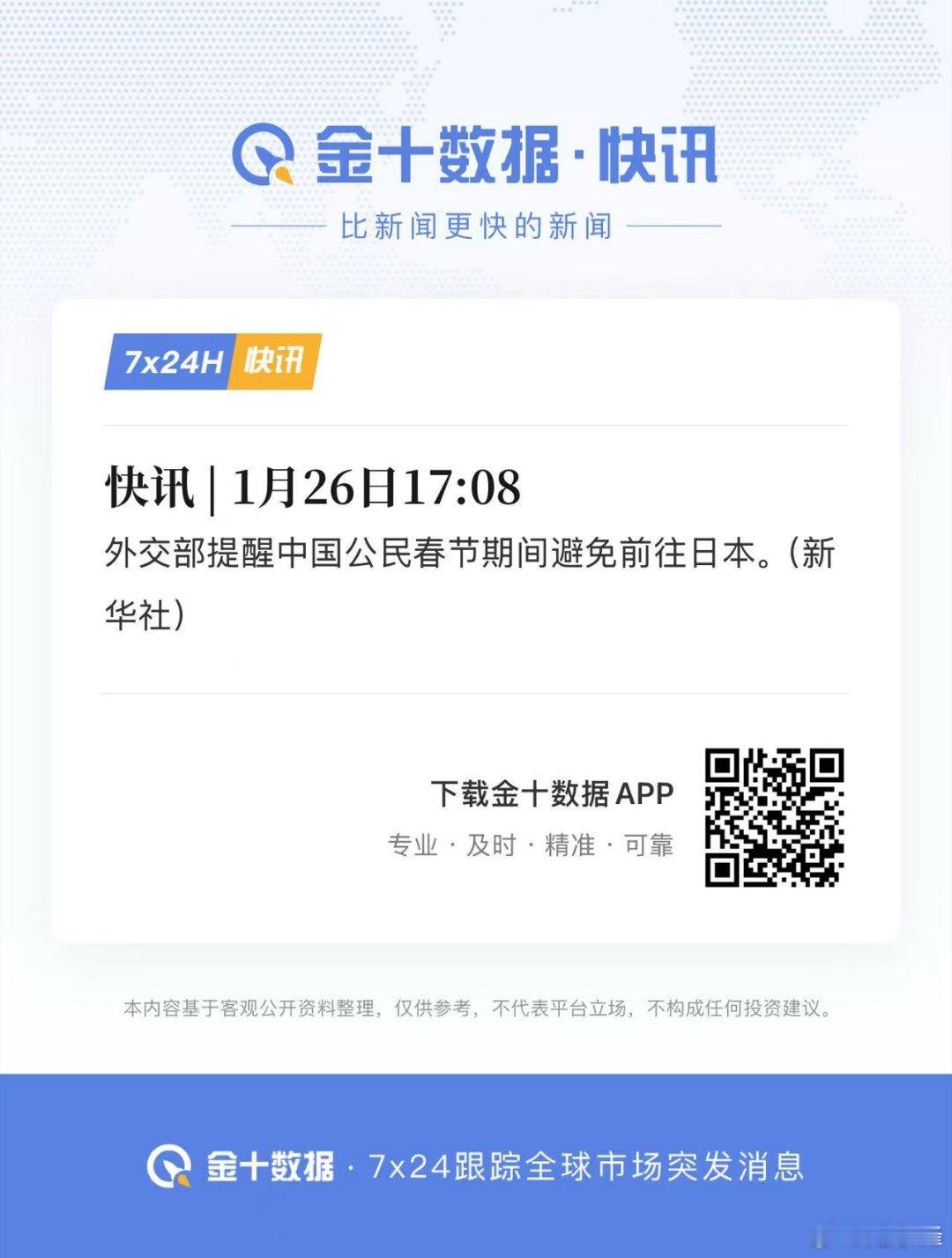 【外交部提醒中国公民春节期间避免前往日本】财联社1月26日电,据新华社,近段时间以来,日本社会治安不靖,针对中国公民违法犯罪案件多发。部分地区连续发生地震,造成人员受伤,日本政府已就后续地震发出警告。中国公民在日本面临严重安全威胁。 农历春节临近,外交部和中国驻日本使领馆提醒中国公民近期避免前往日本,提醒已在日中国公民密切关注当地治安形势,以及地震和次生灾害预警信息,提高安全防范意识,加强自我保护。如遇紧急情况,请及时报警并联系驻日使领馆寻求协助。