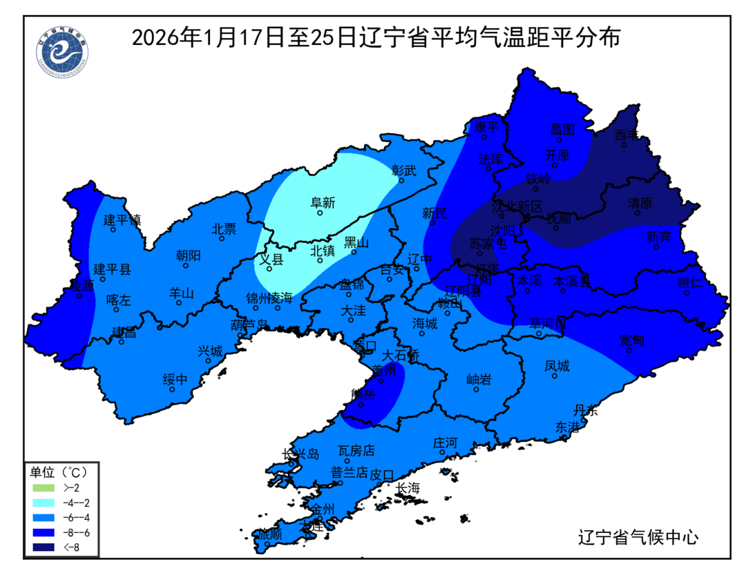 2026年1月17日至25日辽宁省平均气温距平分布(℃)。