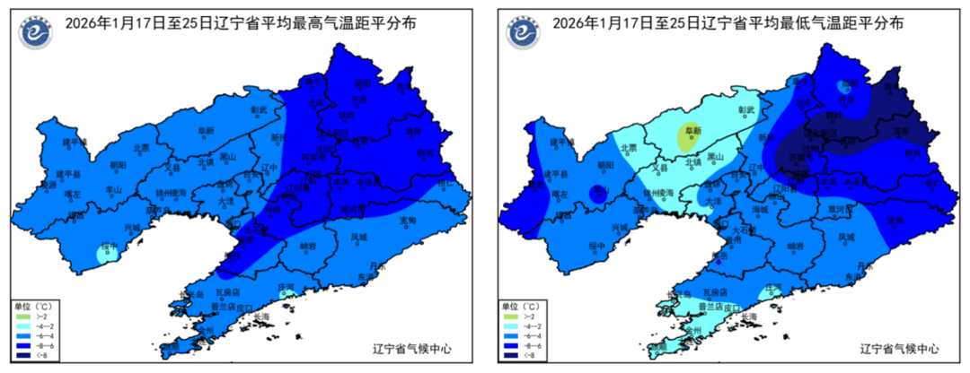 2026年1月17日至25日辽宁省平均最高(左)和平均最低气温距平分布(右)(℃)。