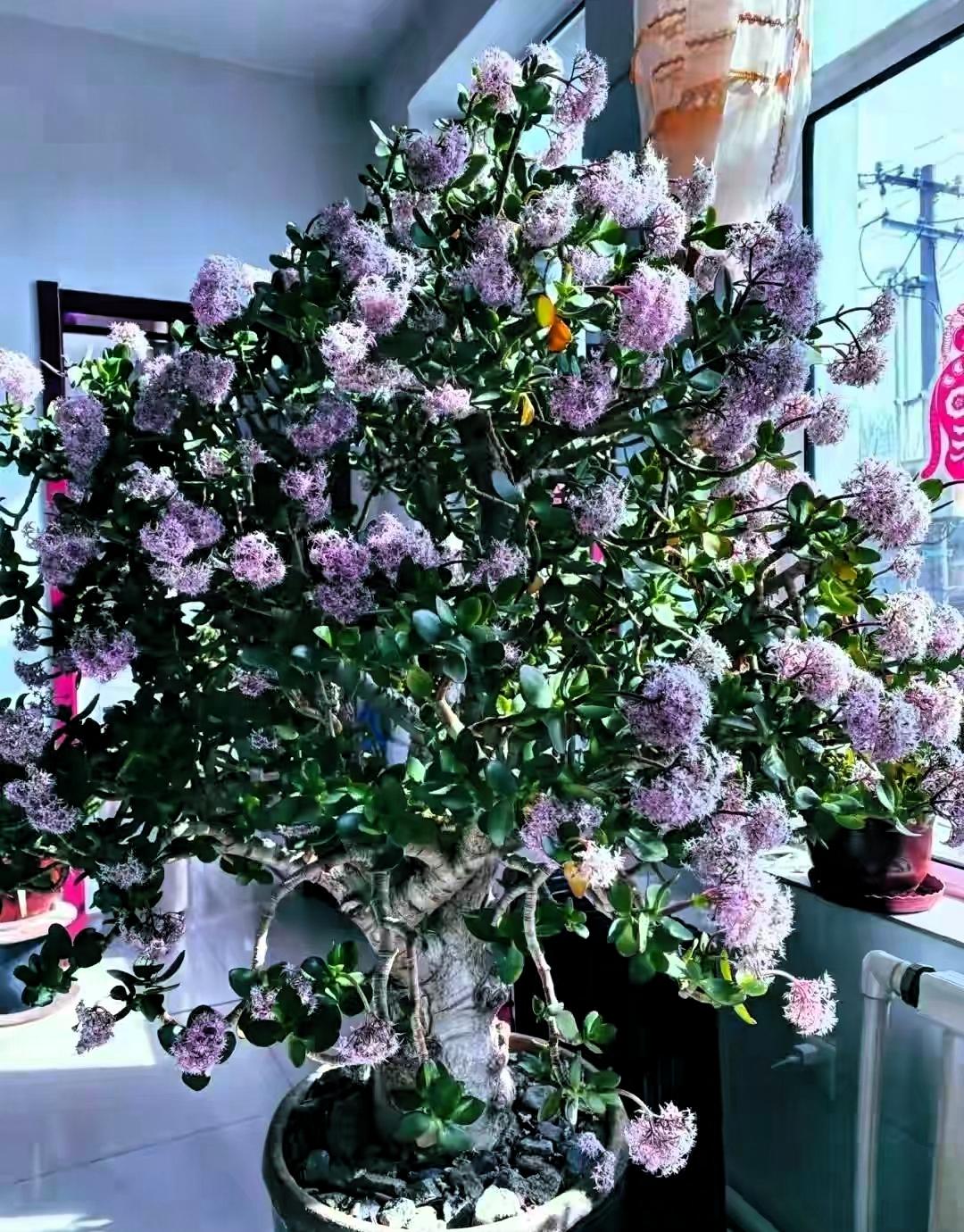 广东一妈妈养21年的玉树,送人前突然爆花上万朵,网友:成精了 这一幕让主人瞬间舍不得送人,也让不少养花人直呼暖心!玉树开花本就少见,民间常说玉树开花需积福,普通品种开白色小花已属难得,这棵老桩能开出淡紫色花,还迎来盛花期,确实是难得的景象。 这棵玉树最初只是一根扦插的小枝条,21年里被主人细心照料,慢慢长成比人还高的老桩,主干粗过小腿,早已成了家里的一份子。主人只是觉得它占地,想着送给别人,没料到它会用开花的方式回应,这份别样的“挽留”,也让人体会到植物的独特灵性。 养花的人都知道,玉树开花从不是偶然,树龄达标只是基础,还需要充足的光照、合适的温差,再加上适度控水,这些养护细节缺一不可。这棵玉树能顺利开花,背后是主人21年如一日的用心,日常的浇水、修剪、挪位晒太阳,每一份付出,都被植物默默记在了心里。 有人说这是吉祥的征兆,其实不如说,这是一场双向的温柔陪伴。主人用时光浇灌绿植,绿植用生长和绽放回馈主人,养花的意义,从来都不只是欣赏花开,更是在日复一日的照料中,收获一份牵挂与温暖,感受付出就有回应的小美好。 植物不会说话,却会用自己的方式表达心意,这份藏在烟火日常里的小美好,总能治愈生活