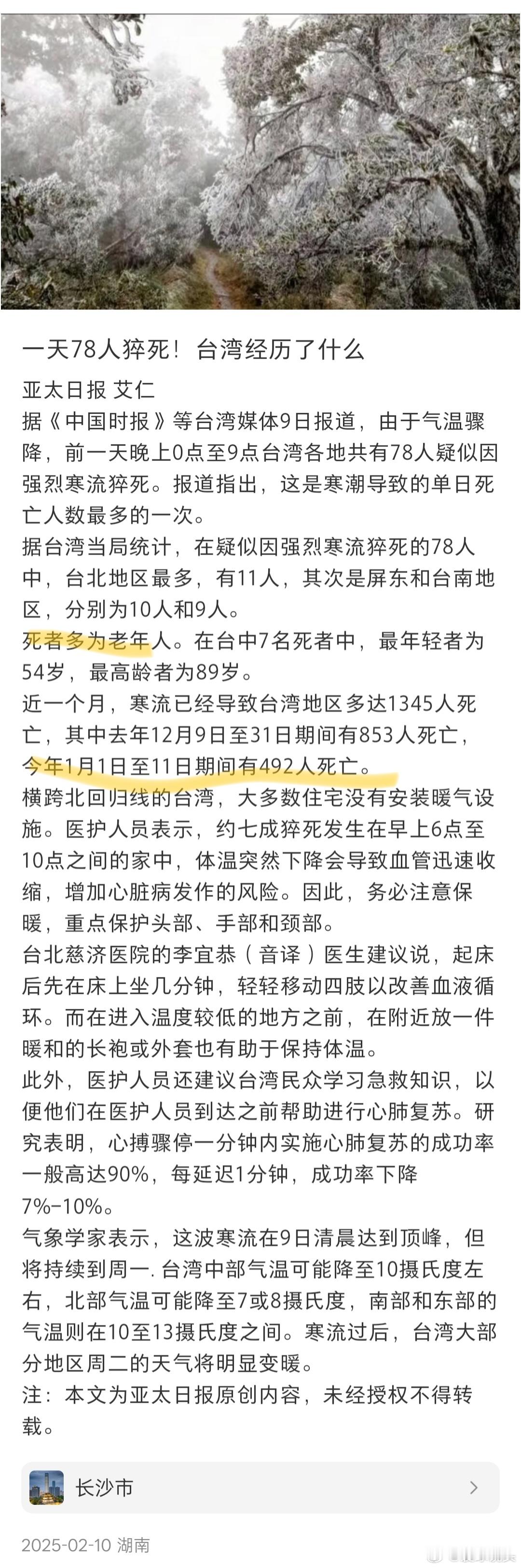 台湾省314人因冷空气去世可能因为统计的不同,关于台湾省今年冻死的人数可能存在差异。一个不争的事实就是,台湾省每年不只是今年,都会因为气候原因冻死不少人,尤其是老年人。