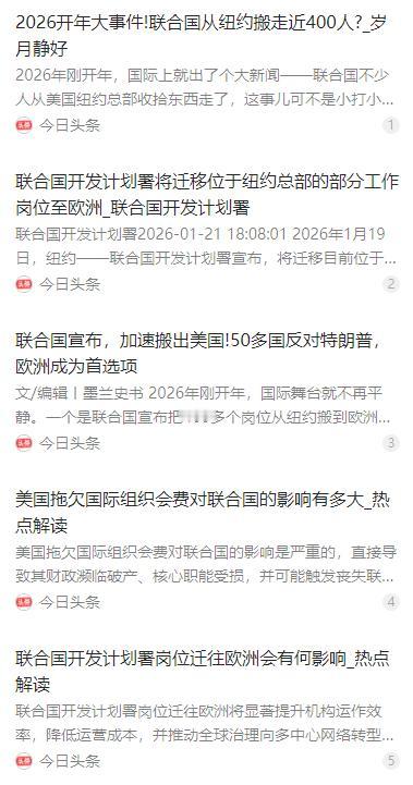 兵马未动粮草先行,难道联合国真的要搬迁了?据1月20日多家权威媒体爆料,联合国直接要把纽约联合国总部附近的开发署等近400个岗位“连根拔起”,全给挪到欧洲去。 麻烦看官老爷们右上角点击一下“关注”,既方便您进行讨论和分享,又能给您带来更多优质的内容,感谢您的支持!   2026 年 1 月 19 日联合国开发计划署正式官宣岗位调整计划,随后 1 月 20 日多家权威媒体跟进报道,这一机构将把纽约总部的近 400 个岗位迁移至欧洲,这一动静在联合国的发展历程里,算得上是少见的大规模岗位调整,也让外界纷纷猜测联合国是否有了搬迁的想法。   纽约作为联合国的总部所在地,自打联合国成立以来,就一直是这份国际组织的核心所在地。秘书处和各大主要机构都集中在这里,靠着东道国美国的各项资源加持,纽约成了联合国名符其实的 “心脏”,各类核心行政工作也长期依赖这片区域开展。   此次确定迁移的近 400 个岗位,并非笼统的分散安置,而是有明确的去向,其中约 300 个岗位将落地德国波恩,剩下的 100 个岗位则迁往西班牙马德里,并非此前说法里的日内瓦等欧洲城市。波恩本就是联合国志愿人员组织的总部,马德里也有适配的办公配套,两地都能快速承接相关工作。   联合国对外公布的迁移原因,核心是控制运营成本和提升工作效率,这也是最直观的考量。纽约曼哈顿寸土寸金,房租和人工成本常年居高不下,相比之下波恩和马德里的运营成本可控,能为联合国省下不少开支,这对当下财政承压的联合国来说尤为重要。   除了成本因素,欧洲的这两座城市早已形成了成熟的联合国机构集群,配套设施完善,相关的办公、外交服务体系都能无缝衔接。再加上疫情之后远程办公模式的常态化,让联合国机构的办公地点不再受地域严格限制,也大大弱化了 “必须待在纽约” 的必要性。   但明眼人都能看出,成本和效率只是此次岗位迁移的表面原因,背后更深层的考量,绕不开美国近些年对联合国的种种态度和行为。作为联合国的东道国,美国本应承担起相应的责任,却在会费缴纳这件事上一再缺位,让联合国的财政运转举步维艰。   截至 2026 年初,美国累计拖欠联合国的会费已经超过 30 亿美元,占了全球联合国会费欠费总额的近九成,2025 年更是一分钱都没有缴纳。要知道联合国全年的常规预算也仅有 34.5 亿美元,这笔巨额欠款直接让联合国的各项工作陷入资金困境。   除了拖欠会费,美国还频频将自身的政治诉求凌驾于联合国之上,不仅多次施压联合国相关机构,还滥用东道国的特权,利用签证问题刁难其他国家的联合国代表,让联合国的正常运作处处掣肘。特朗普政府上台后,更是退出了 66 个国际组织,其中 31 个都属于联合国体系。   面对美国反复摇摆的态度和各种单边主义行为,联合国此次迁移岗位,也是为了分散运营风险,不再将核心行政力量过度集中在纽约,避免因美国的各种行为,让联合国的工作陷入被动。毕竟把所有 “鸡蛋放在一个篮子里”,对国际组织的长远发展本就不利。   而欧洲国家成为此次岗位迁移的接收方,也并非偶然。欧洲多国始终坚定支持多边主义,这与联合国成立之初的传统价值观高度契合,也能为迁移后的联合国相关机构提供稳定的政策和场地支持。德国和西班牙更是主动提供优惠政策,全力承接此次迁移的岗位。   此次联合国开发计划署的岗位迁移,并非临时的应急之举,而是经过长期考量的中长期布局。在此次欧洲迁岗之前,2026 年初该机构就已经将 30 个纽约的岗位调配至非洲、拉美、亚太等地区的区域办事处,让工作人员更贴近服务的社区和人群。   值得注意的是,此次近 400 个岗位的迁移,并不意味着联合国总部将搬出纽约,纽约仍将继续作为联合国开发计划署的全球总部。目前该机构在全球 170 多个国家和地区开展工作,全球员工约 2.2 万人,常驻纽约总部的人员占比本就不足 7%。   即便如此,这次大规模的岗位调整,依然释放出了明显的信号。冷战之后形成的单极国际秩序正在逐渐松动,多极化的发展趋势越来越明显,这也是当下国际社会的主流发展方向。联合国的这一动作,正是顺应了这一国际秩序的变化。   对联合国而言,此次迁岗也是机构改革的重要一步,通过优化办公布局,降低运营成本,让有限的资金更多地投入到消除贫困、保护环境、危机救援等核心工作中,提升自身支持全球脆弱人群的能力,这也是联合国作为国际组织的核心使命。   而从美国的角度来看,此次联合国的岗位迁移,也是对其单边主义行为的一次回应。当一个国家不再承担应有的国际责任,甚至频频破坏多边主义体系,自然会被逐渐推离国际舞台的核心。美国若继续坚持当下的做法,其在全球治理中的话语权也将不断被削弱。