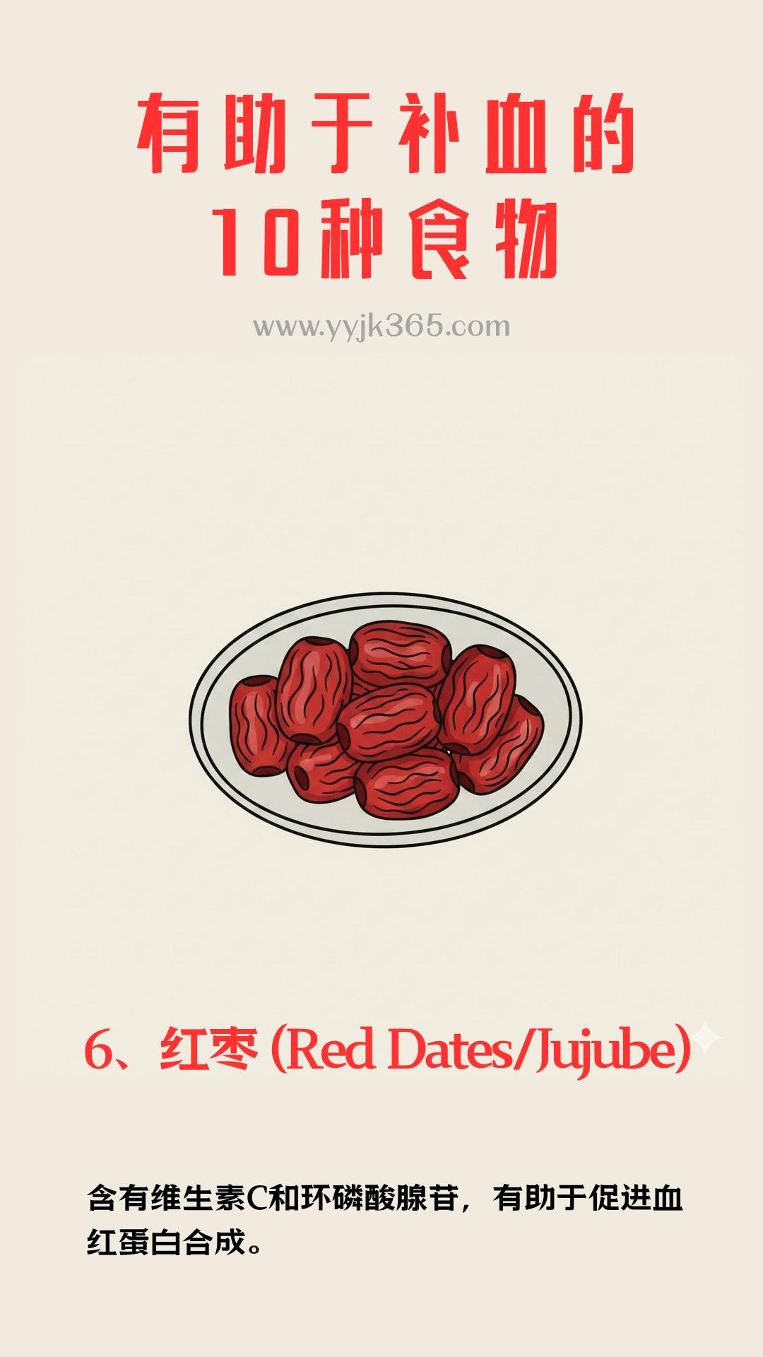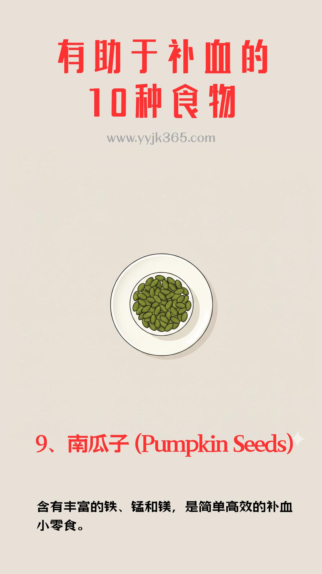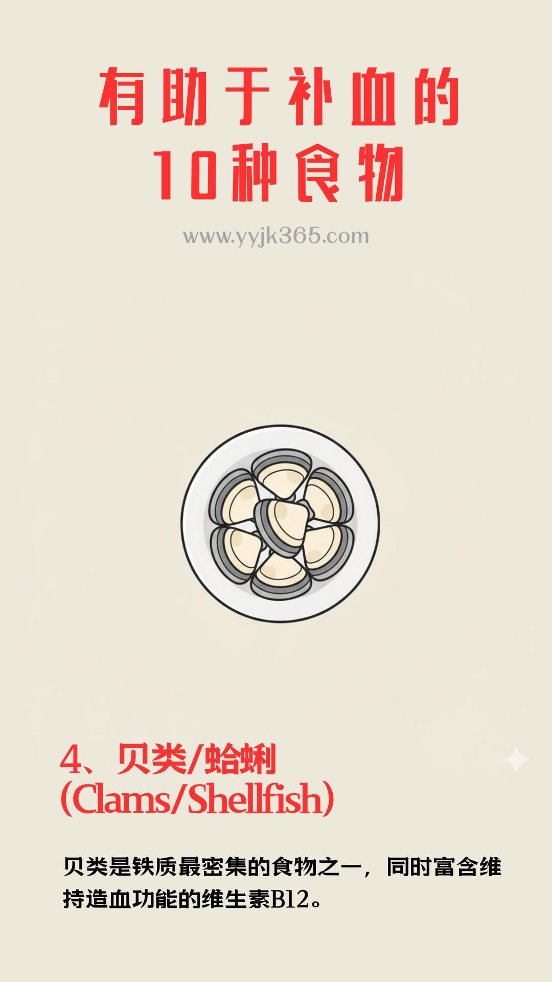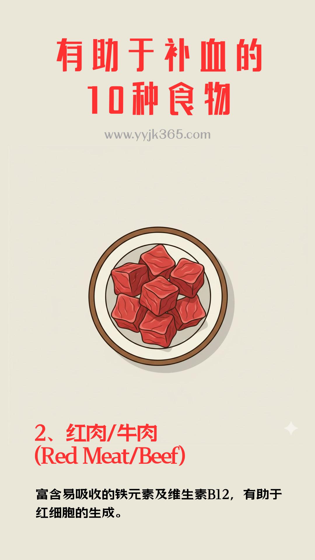 有助于补血的10种食物 1、动物肝脏 (Beef Liver) 铁含量极高,且属于血红素铁,吸收率极佳,是补血的首选。 2、红肉/牛肉 (Red Meat/Beef) 富含易吸收的铁元素及维生素B12,有助于红细胞的生成。 3、菠菜 (Spinach) 含有丰富的非血红素铁和叶酸,是素食人群补血的重要来源。 4、贝类/蛤蜊 (Clams/Shellfish) 贝类是铁质最密集的食物之一,同时富含维持造血功能的维生素B12。 5、黑芝麻 (Black Sesame) 含有大量的铁和矿物质,在中医传统中也是极佳的补血食材。 6、红枣 (Red Dates/Jujube) 含有维生素C和环磷酸腺苷,有助于促进血红蛋白合成。 7、小扁豆 (Lentils) 优秀的植物蛋白和铁质来源,非常适合贫血人群的日常主食补充。 8、黑木耳 (Black Fungus) 铁含量远高于肉类,具有极强的补血和清理血管的功效。 9、南瓜子 (Pumpkin Seeds) 含有丰富的铁、锰和镁,是简单高效的补血小零食。 10、红糖 (Brown Sugar) 含有微量元素及叶酸,有助于刺激造血功能,适合经期或产后补血。 更多营养健康知识分享,可以访问我的网站:yyjk365.com,免费提供代谢评估服务。