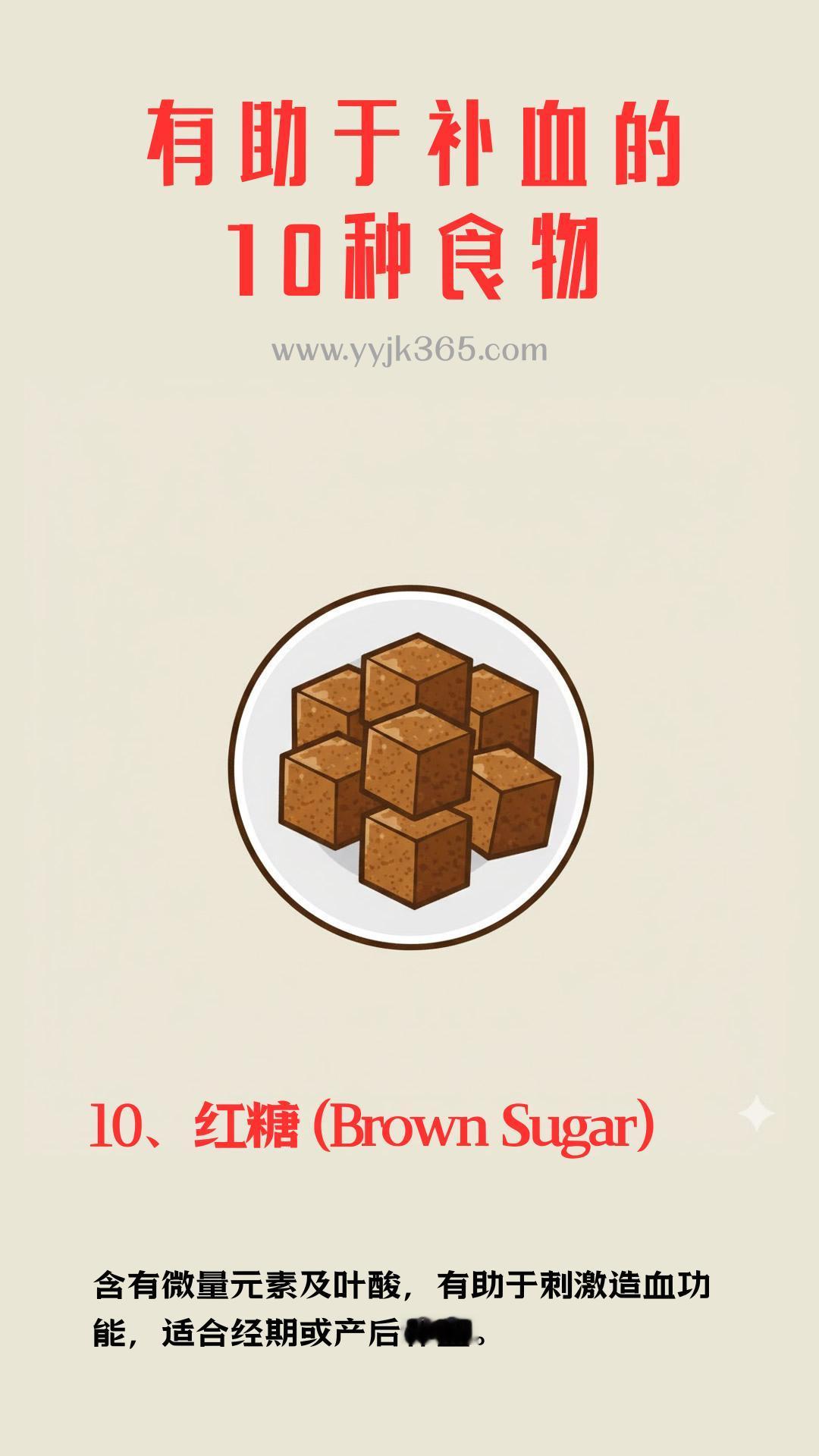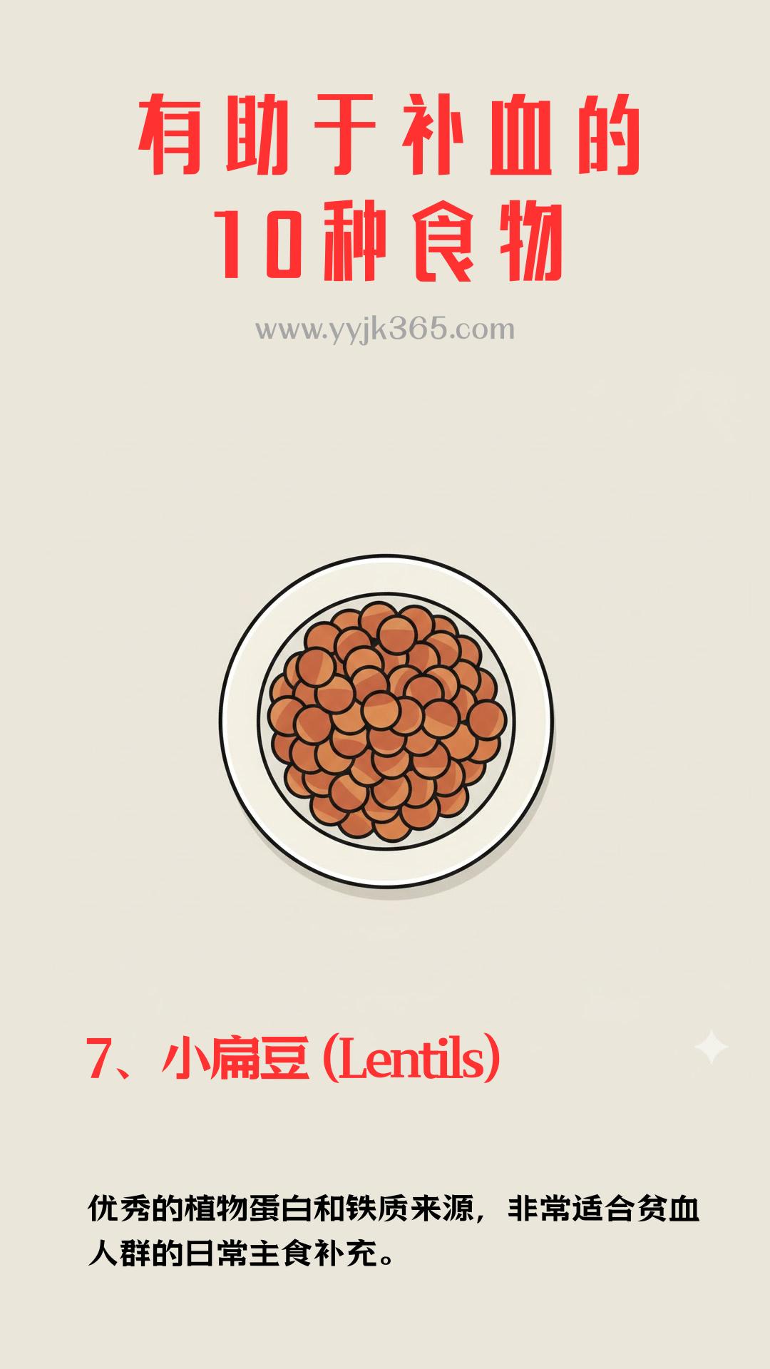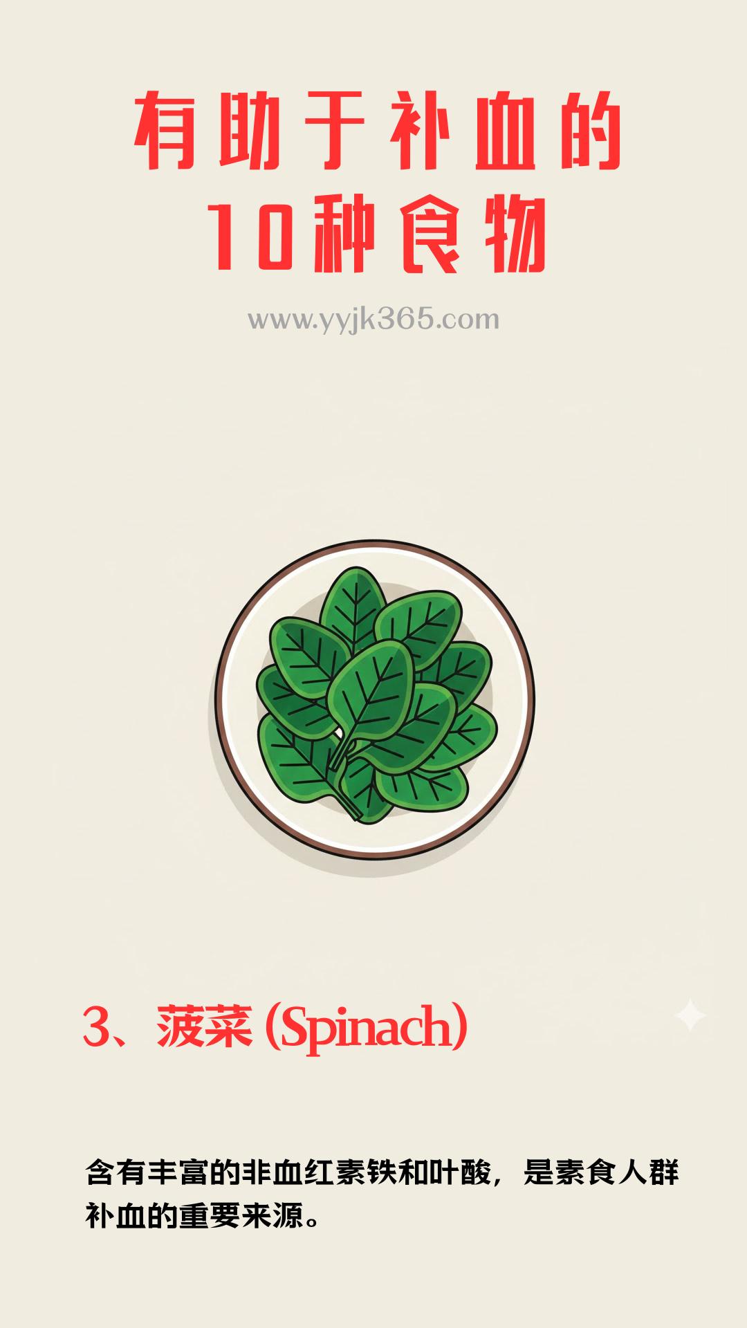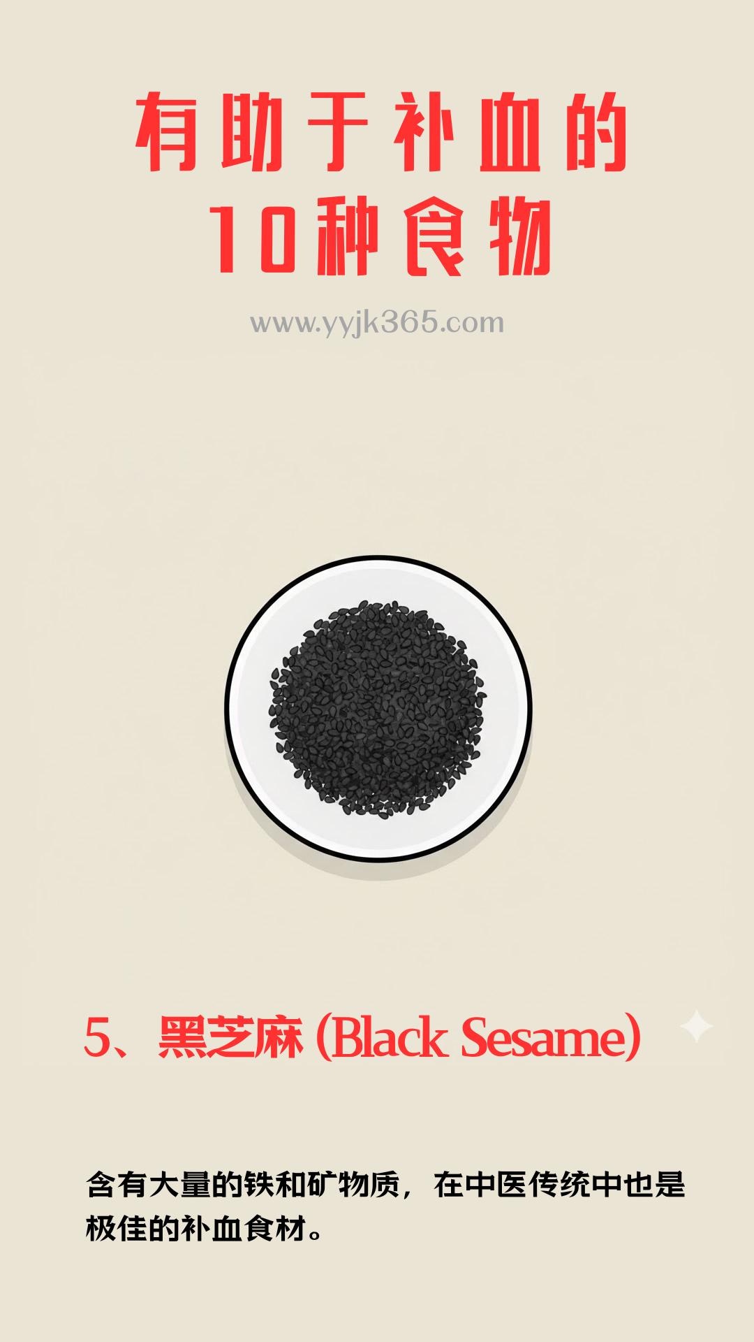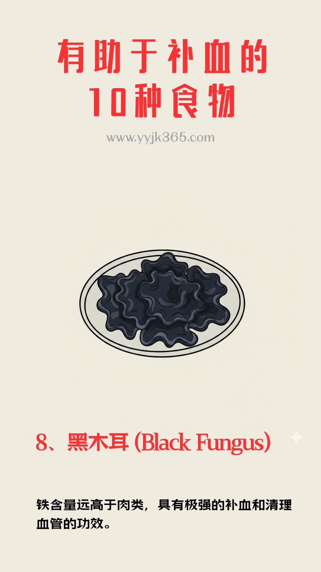 有助于补血的10种食物 1、动物肝脏 (Beef Liver) 铁含量极高,且属于血红素铁,吸收率极佳,是补血的首选。 2、红肉/牛肉 (Red Meat/Beef) 富含易吸收的铁元素及维生素B12,有助于红细胞的生成。 3、菠菜 (Spinach) 含有丰富的非血红素铁和叶酸,是素食人群补血的重要来源。 4、贝类/蛤蜊 (Clams/Shellfish) 贝类是铁质最密集的食物之一,同时富含维持造血功能的维生素B12。 5、黑芝麻 (Black Sesame) 含有大量的铁和矿物质,在中医传统中也是极佳的补血食材。 6、红枣 (Red Dates/Jujube) 含有维生素C和环磷酸腺苷,有助于促进血红蛋白合成。 7、小扁豆 (Lentils) 优秀的植物蛋白和铁质来源,非常适合贫血人群的日常主食补充。 8、黑木耳 (Black Fungus) 铁含量远高于肉类,具有极强的补血和清理血管的功效。 9、南瓜子 (Pumpkin Seeds) 含有丰富的铁、锰和镁,是简单高效的补血小零食。 10、红糖 (Brown Sugar) 含有微量元素及叶酸,有助于刺激造血功能,适合经期或产后补血。 更多营养健康知识分享,可以访问我的网站:yyjk365.com,免费提供代谢评估服务。