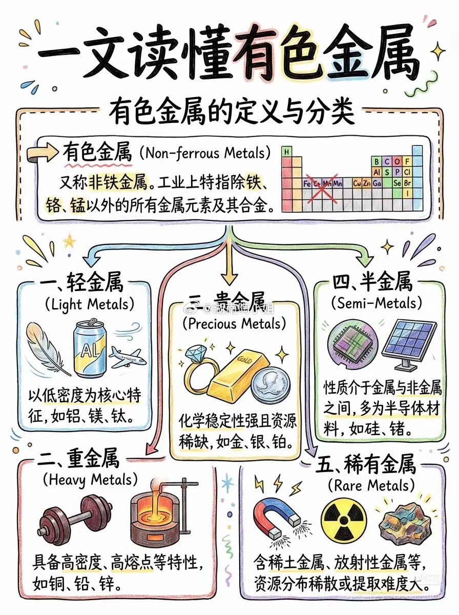 2026年资源太火了,一分钟看图带你了解什么是有色金属,有色金属是铁、锰、铬外所有金属的统称,是国民经济和新兴产业基础材料,分轻金属、重金属、贵金属、稀有金属四类,具备导电导热、延展耐腐蚀等特性,部分有特殊理化性能,广泛用于新能源、电子信息等领域,是战略新兴产业升级核心支撑。有色金属产业链有色产业链