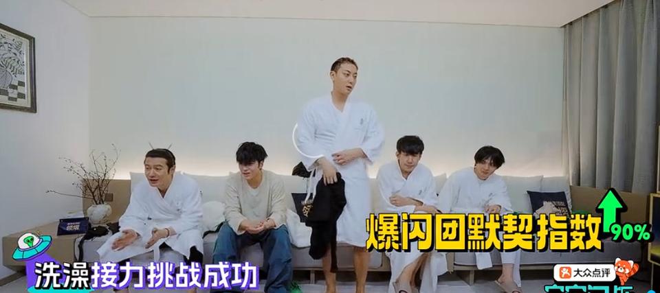 宇宙爆闪团6兄弟挑战7分钟全员接力洗澡,刘耀文太好笑了,说自己洗澡快一分钟就行,结果用了三分钟,当场打脸!黄子韬这个急性子洗澡只用29秒,还没进浴室就着急想先脱裤子,把刘耀文都吓得张大了嘴。 节目组给兄弟团一个限时接力洗澡挑战,考验大家在时间的压力下,沟通的效果,任务的分配能力以及彼此的信任程度,如果在7分钟之内全员都能接力洗完澡,那么明天就可以不用穿连体服了。 刘耀文第一个进去洗澡,没想到直接用了将近3分钟。 于洋在门外着急的喊,你不是说从小洗澡就一分钟吗?听到刘耀文说已经在穿裤子了,他马上怼到,别穿裤子了,就显摆你有腿啊!快穿浴袍出来吧! 他自己也不意思的解释说,他的穿的秋裤不好脱! 留给最后一棒的黄子韬只有40秒的洗澡时间。 黄子韬有些着急的想要提前脱裤子,直接吓到了刘耀文。 黄子韬这才想到了先让摄像机回避,他要提前准备好。最后他只用了29秒就洗完了澡,穿着浴袍就出来了。 果然,爆闪团连接力洗澡都很有梗!