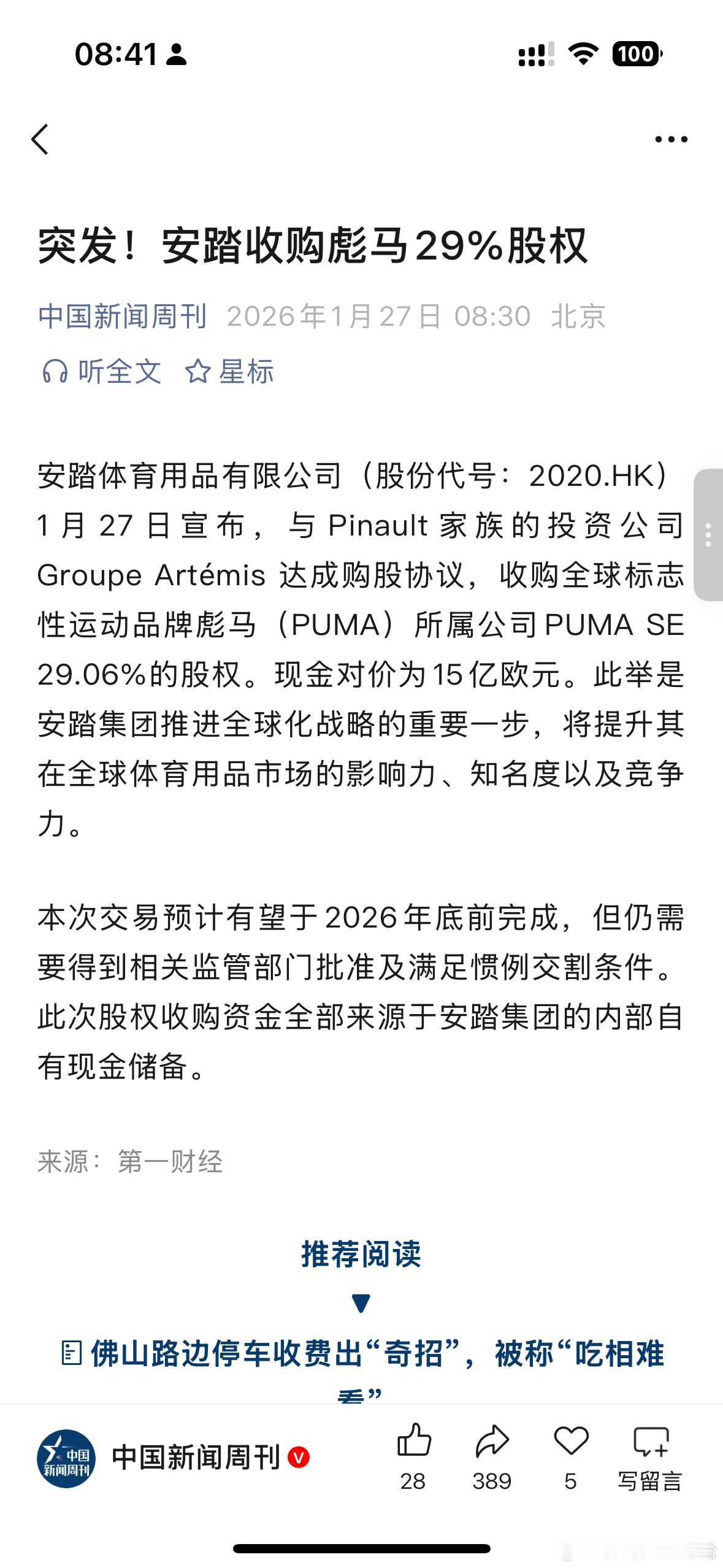 没想到靴子这么快落地了,安踏15亿欧元收购彪马29%的股权!安踏彪马
