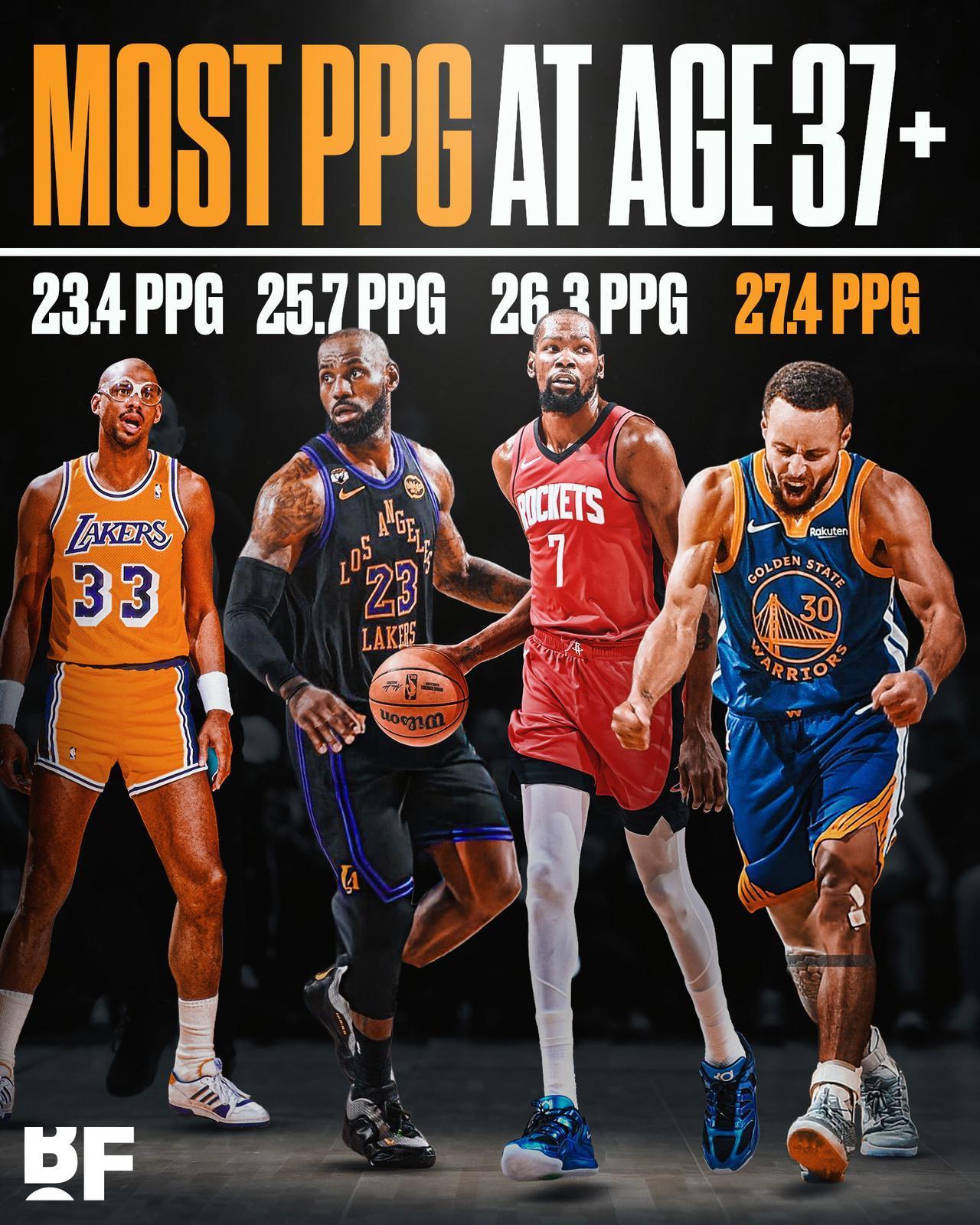球员在37岁或以上年龄赛季的场均得分最高纪录: 🔸2025-26赛季 斯蒂芬·库里 - 27.4 分 🔸2025-26赛季 凯文·杜兰特 - 26.3 分 🔸2024-25赛季 勒布朗·詹姆斯 - 24.4 分 🔸1985-86赛季 卡里姆·阿卜杜勒-贾巴尔 - 23.4 分 库里37岁了依然表现出色!🔥