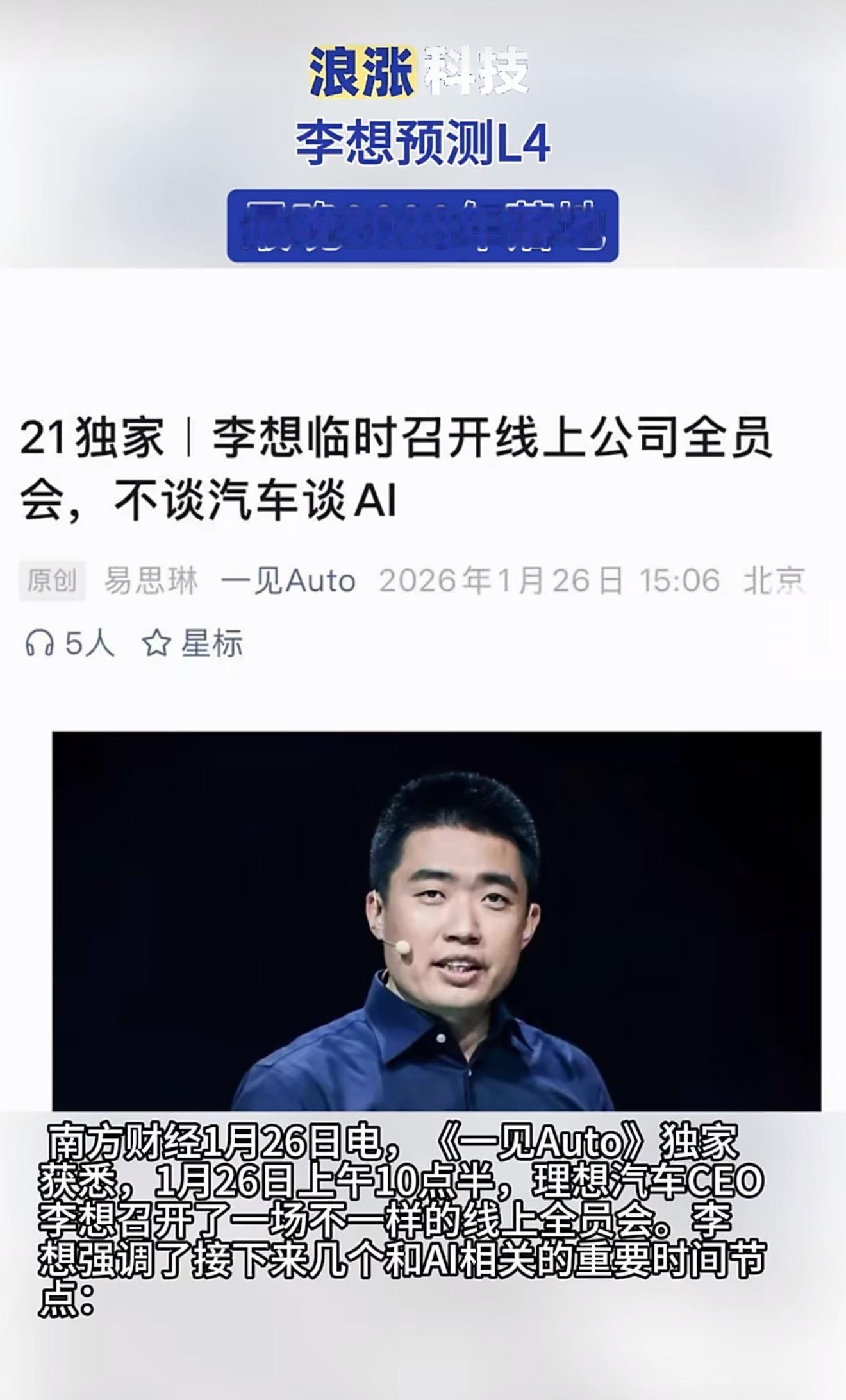 我觉得李想说L4最晚2028年落地,这话还是挺靠谱的。现在车企的智驾技术迭代都很快,理想自己也有全栈自研的底子,实测数据堆了不少,硬件芯片也在跟进,技术层面的准备越来越足了,而且这两年法规也在慢慢完善,大环境在往这走。但也不是没难度,极端路况的应对、算力成本控制,还有各地法规的统一,都是坎儿。2028这个时间点,是技术和行业成熟度的一个合理预判。李想预测L4最晚2028年落地