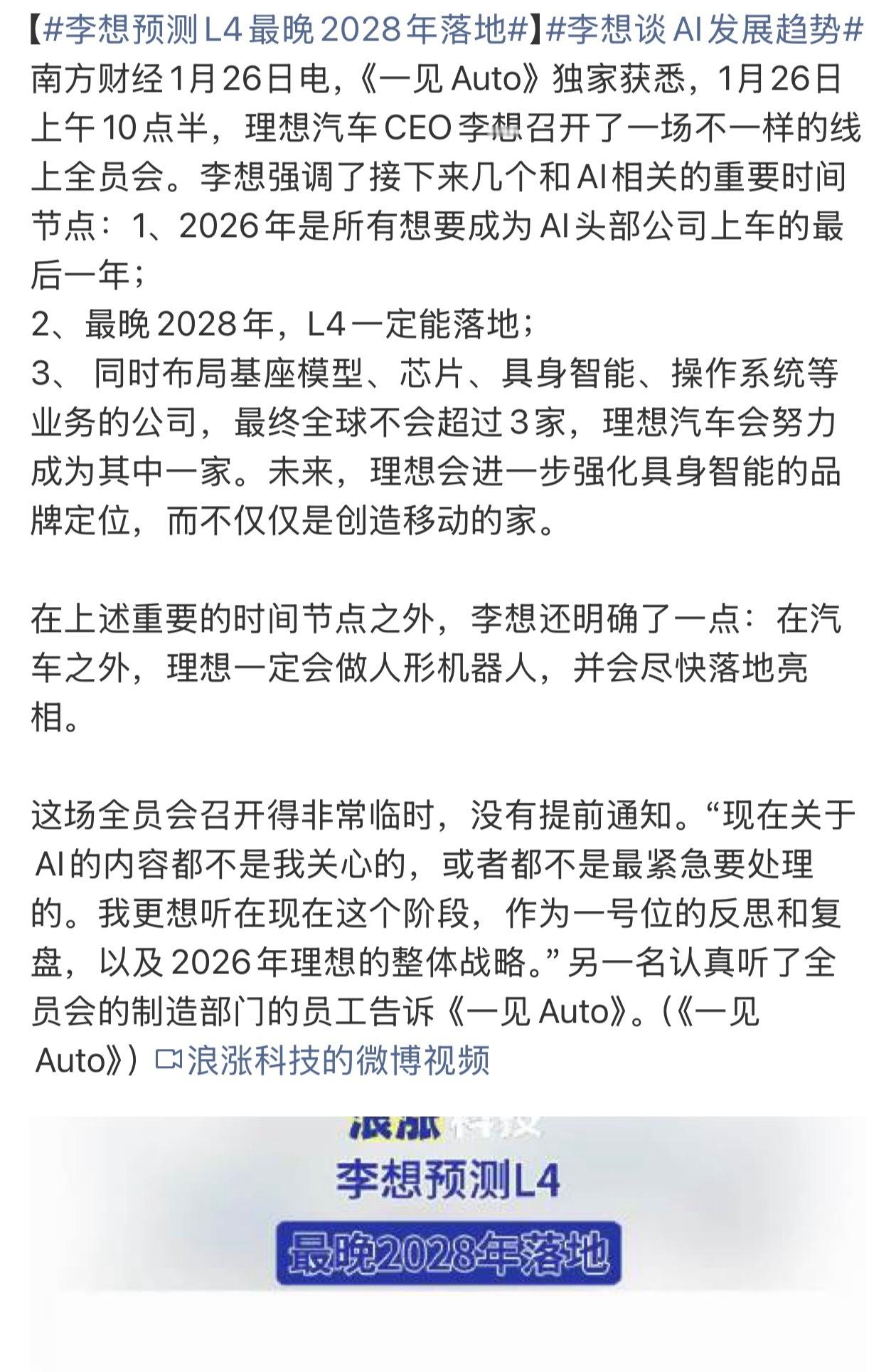 我以前就讲过,李想要做的并不是仅仅是创造移动的家,而且以车为载体的AI智能体。每个人企业都在努力向AI这个方向靠拢,但是能有清晰规划的只有那么几家。李想也在时刻思考作为一个车企,未来的方向应该是什么。很显然,李想思考和规划的有点深入,而且要做好很难。但是我觉得,有了第一步的深度思考,才有了走向成功的前提。我现在最期待的还是理想人形机器人的落地,毕竟理想AI智能眼镜Livis的表现很不错,人形机器人也值得期待。另外现在大部分人形机器人都是在炫技,都是在以技术为导向做产品,我还真想看看理想怎么以用户以产品思维做产品是一种怎样形式的机器人。李想预测L4最晚2028年落地