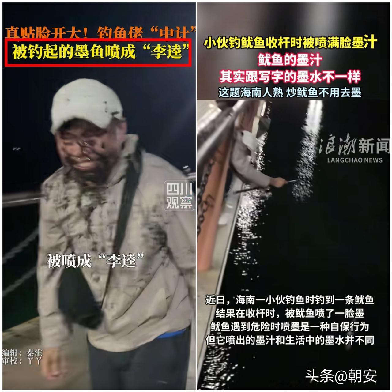 笑不活了! 三亚大哥海边夜钓遇上成精墨鱼,本想小心翼翼拿捏对方,结果 被喷成黑