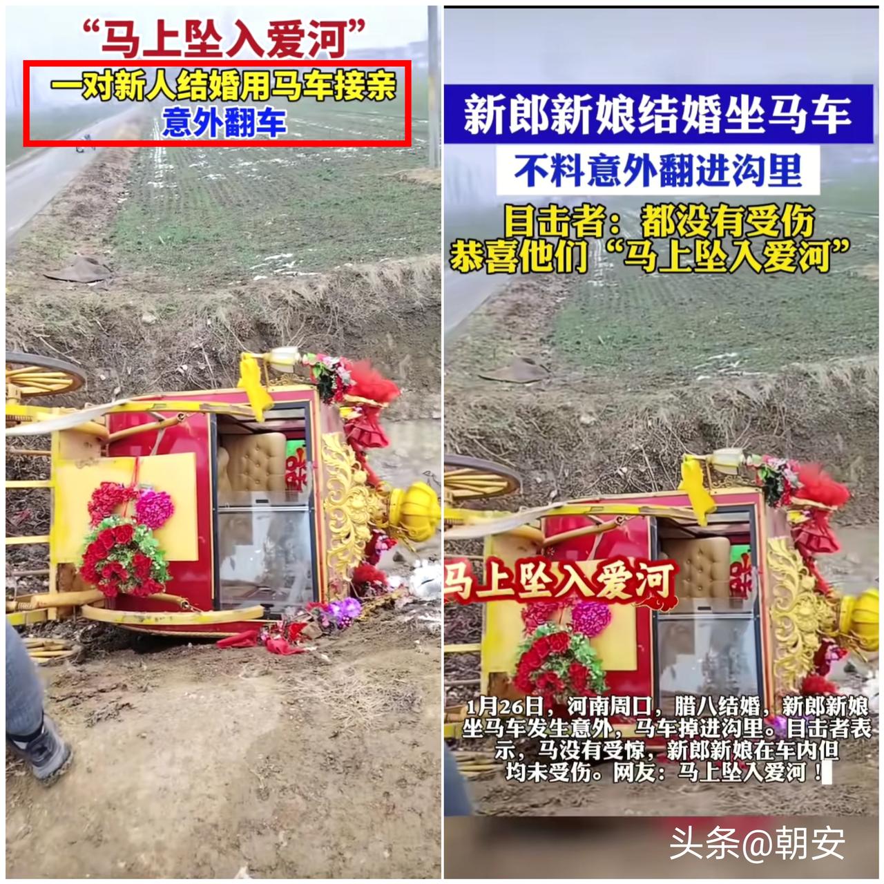 万万没想到! 河南周口这对新人的婚礼太戏剧了,用当地传统马车接亲,结果 半道马车翻进沟里,还好新人没受伤,这事儿想想又惊险又哭笑不得。 本来想图个传统喜庆,结果闹出这么个小插曲,也让不少人开始讨论,传统婚俗该怎么守才合适。 守习俗从来不是死搬硬套,更不是拿安全当赌注。 当地用马车接亲的传统本是特色,但马匹易受惊的特性摆在这,没专业的驯养和防护,在道路上走本就有隐患,礼炮、车流都可能成为意外的导火索。 有人说翻沟不吉利,这都是老说法,真正该在意的,是把传统和安全结合起来,而不是要么全守要么全丢。 传统的美好在于仪式感和心意,而非形式上的一成不变,与其纠结要不要改习俗,不如琢磨怎么让老习俗适配当下的安全需求。 你们觉得,地方传统婚俗该如何兼顾仪式感和安全性呢?