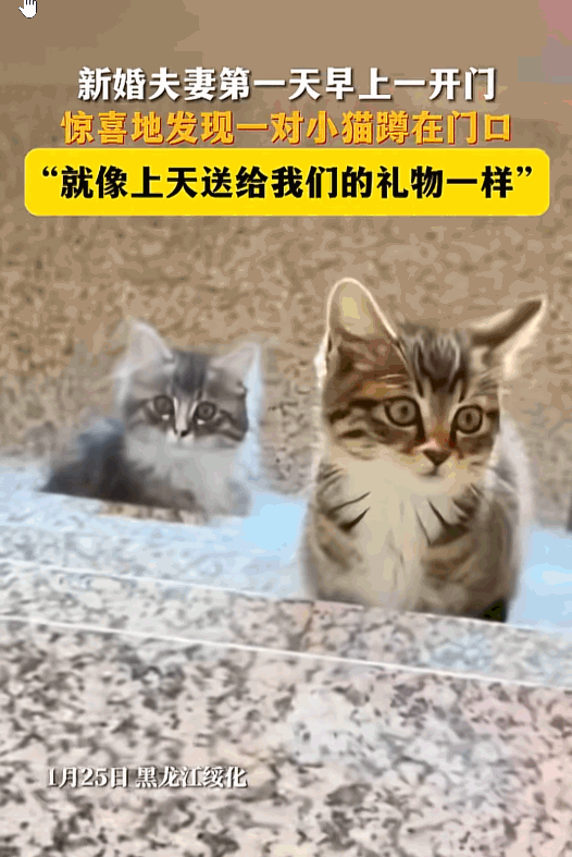 解释不清了!近日黑龙江,女子刚跟丈夫结婚,第二天开门时,看见有两只小猫在自己家门口坐着,丈夫看见后就冲小猫拍了一下手,没想到两只小猫就像是有感应一般,就走了屋里,一点都不怕人,好像是上天赐给夫妻俩的礼物一样。 1月25日,这俩人刚办完婚礼,热热闹闹忙完一场,总算能松口气,踏踏实实过二人世界了。 第二天一早,小两口睡醒推开家门,本来想好好过婚后第一天,结果一开门就愣着了——两只小小的猫咪,正乖乖蹲在门口,安安静静的,瞅着就跟在这儿等了挺久似的。 丈夫看见也没赶它们,就下意识抬手轻轻拍了一下,没成想这俩小猫一点儿不怵人,反倒像是天生就跟这对新人亲,顺着他拍手的动静,慢悠悠就走进屋里了,一举一动都温温顺顺的,哪儿像在外头流浪的小家伙那样警惕。 这突如其来的缘分,可把小夫妻俩高兴坏了,一个劲儿说,这就跟老天爷特意给他们送的新婚礼物一样。 那时候绥化冷得邪乎,气温都降到零下三十多度了,这么冷的天,没家的小动物想活下来太难了,也正因为这份难,才让这场偶遇多了点说不清道不明的缘分感,也难怪小猫会主动凑到人家门口找靠山。 这事儿传到网上之后,网友们聊得可热闹了,说法五花八门,但都透着股暖意。 不少人搬出老辈人常说的俗语,觉得两只小猫上门就是好兆头,还说“猫来起大厝”,俩猫一块儿来,更象征着成双成对、一家人和和气气,还有人玩起谐音梗,猜这说不定是要添丁的好苗头。 也有网友说,特别羡慕这份缘分,小猫性子温顺,刚好配得上新婚小家庭的和睦劲儿,这绝对是最特别的新婚贺礼。 这桩双猫临门的美事儿,就是善意和幸运凑到了一块儿,它既不是什么老天爷显灵送的奇迹,也不是小猫故意碰瓷儿,就是小动物靠着自己的生存小聪明,刚好遇上了心善的人罢了。 现在大伙儿的生活节奏都快,这么一件小事之所以能打动人,就是因为它唤醒了我们对生活里那些温柔小瞬间的感觉。 人和动物之间的感情,从来不用扯那些复杂的道理,愿意接纳、伸手帮一把,就足够让这冰冷的冬天变暖和了。 希望这份暖意能带动更多人做点实在事,让每一只流浪的小动物都能找到属于自己的家,让人和万物好好相处的样子,变成日子里最平常不过的风景。 信息来源: 南昌西湖发布
