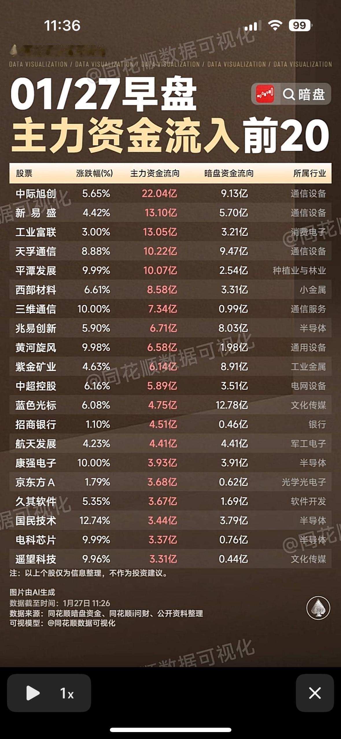 1月27日早盘主力资金流入前20名股票,快来看看有没有你的股票! 主力资金流入个股盘点:通信、半导体、文化传媒等板块领涨,数据截至1月27日早盘