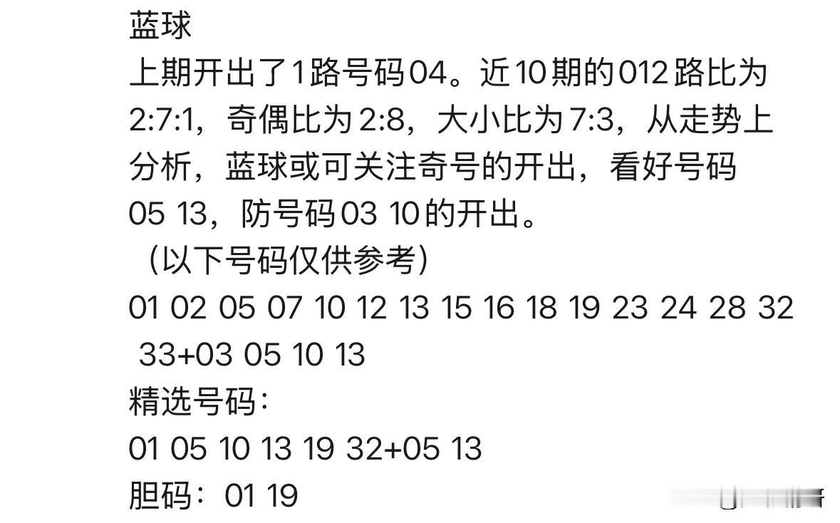 双色球26012期开奖在即,湖北辛丹丹再次携精选号码登场。本期丹丹还是主推“6+2”组合:红球01、05、10、13、19、32,蓝球05、13。其中看点纷呈: 一、斜连走势持续,本期重点关注三个斜连码:01、05和19; 二、重号方面,看好大数32延续热度; 三、一区有望再度开出3码,与上期形成呼应; 四、红球胆码聚焦01与19,皆为奇数; 五、蓝球四码围捕01、05、01、13,其中奇数05、13最为看好。 回顾上期,丹丹战绩不俗,大底命中“4+1”,红球胆码二中其一。今晚,她是再续辉煌,抑或稍显沉寂?让我们共同期待开奖结果揭晓。