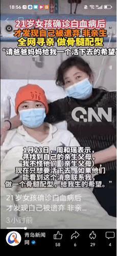 万万想不到!21岁女孩患白血病后,治疗期间因血型配型,才发现自己和自己朝夕相处,无私爱她的父母并非亲生,而是在她刚刚就出生时被养父母捡到的。她在社交媒体上说,希望能够找到亲生父母,给自己一个活下去的机会。 2025年7月,正在读大四的周和瑶暑假并没有回家,而是留在了学校备战考研。 最近的几个月,小周总是感觉不舒服,头晕,乏力,还没有胃口,吃东西也不香,她以为自己天天紧张学习熬夜累着了。也就没当回事,仍留在学校继续学习,也没有把她的身体状况告诉父母。 7月底的一天,她突发高烧,但还是以为自己感冒了,于是就去买了感冒药及消炎药吃。可让她意想不到的是,药吃下去根本没有任何效果,依然高烧不退。 发现小周的病状,同学们非常担心,坚决把她送进了医院,到医生检查后发现她的白细胞异常,不像通常似感冒症状。于是马上通知她的父母带她作进一步的检查。 回到家乡后,父母马上把她安排住院,检查结果让家人崩溃!她患的是白血病。父母倾尽了家产帮她治疗,终于她的病情有所好转。 但在2025年12月,小周再次发病,这次医生给出的治疗方案是必须要换骨髓。骨髓移植风险最小的是兄弟姐妹及父母亲。而这时父母亲不得不告诉她一个更残酷的事实:她是父母20多年前在家门口捡到的! 如果不是这一场疾病,小周不知何时才能知道她的身世。在她的记忆中,她的养父母一直都是把她捧在手心里养大的,给予她最好的照顾。 现在小周想要活下去,而亲生父母的骨髓配对就成了她活下去的希望。 可是二十多年了,她的亲生父母在哪里呢?无奈之下,小周只得求助媒体希望她的亲生父母能够看到这个视频 到目前为止,小周的求助仍在进行中,仍然没有亲生父母的消息。 希望大家帮帮这位姑娘! 取材网络,侵删。个人观点,仅供参考。