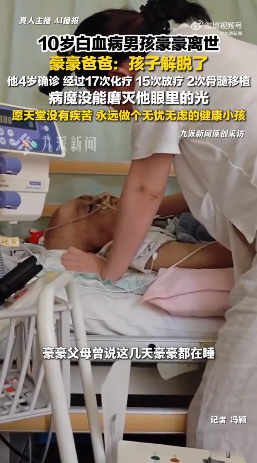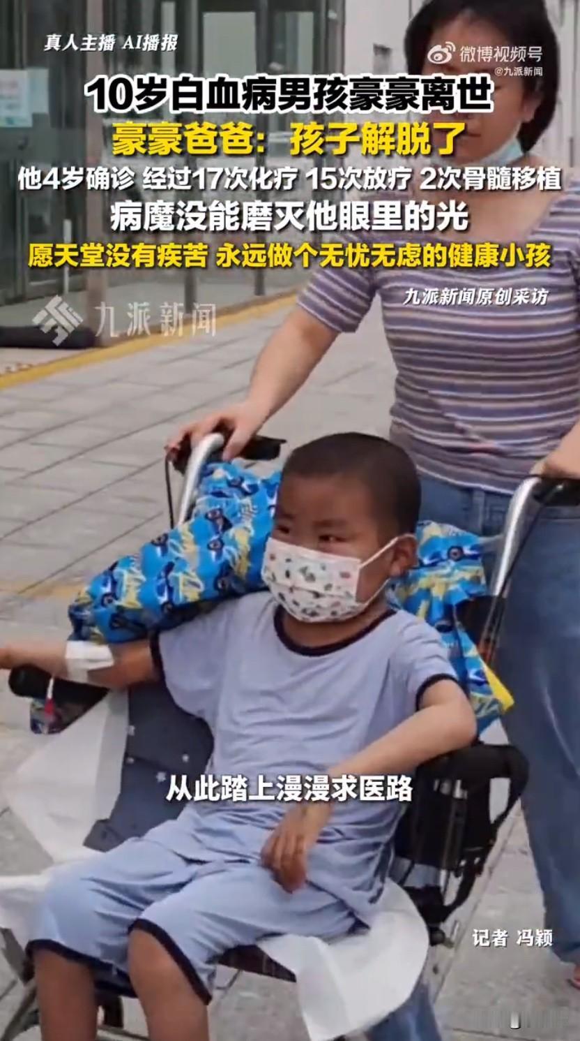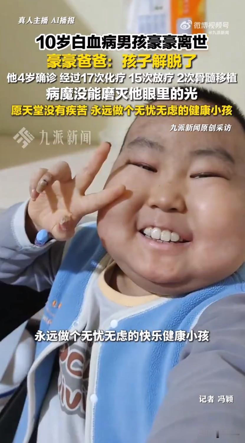 那个曾喊着“王子请恢复健康”的贵州小男孩豪豪,终究还是离开了这个世界,听到豪豪爸爸一句“孩子解脱了”,无数牵挂他的网友心里都揪得生疼,这个和白血病抗争了六年的10岁孩子,终于不用再忍受病痛的折磨了。豪豪四岁那年,身上莫名出现瘀青,被确诊为急性髓系白血病,从此小小的他就踏上了漫漫求医路,17次化疗、15次放疗,还有两次骨髓移植,这些连成年人都难以承受的痛苦,全都压在了这个孩子身上。化疗时的头痛掉发、骨穿时的钻心疼痛、移植仓里的封闭压抑,豪豪都咬着牙扛了过来,哪怕病情恶化到一只眼睛几乎睁不开,他还会笑着安慰爸爸,说像电影里的海盗一样,一只眼睛也很酷,这份超出年龄的懂事和乐观,看了就让人忍不住心疼。病房里的豪豪被大家叫做“小太阳”,他总把治病比作“打败小怪兽”,把难喝的药物戏称为“饭后小甜点”,难受的时候就刷短视频分散注意力,还会跟着学网络热梗,对着镜头大方求祝福。那句火遍全网的“王子,请恢复健康,永不复发”,就是他顶着药物肿起的“大饼脸”,比着招牌剪刀手喊出来的,短短几天就收到二十万条网友的鼓励,大家都希望这个爱笑的孩子能迎来好运。他也有很多普通小孩的心愿,想背着书包正常上学,想和小伙伴一起玩耍,还曾唱着歌对爸妈说,等长大要带他们去看天涯海角的浪花,甚至在化疗反应最剧烈的时候,懂事地跟爸妈说如果自己没了,就让他们再生一个小孩,这话让父母心碎不已。本以为熬过一次次治疗就能迎来希望,2024年病情趋稳的豪豪还回了老家休养,可复查结果却打破了所有平静,白血病细胞难以清除,恶性肿瘤病灶也无法控制,病情急转直下。医生说再用昂贵的药物,也只是增加孩子的痛苦,一家人的心愿从“求治愈”变成了“让他舒服一点”,爸爸还悄悄拉黑了他的短视频账号,编织了温柔的谎言,守护着他最后的希望。无数爱心人士想要捐款帮忙,都被豪豪爸爸婉拒了,他说不想再消耗大家的善意,这份恩情全家都会永远铭记。豪豪最后几天大多在昏睡中度过,偶尔努力想说话,也只听清了“难受”两个字,这个拼尽全力和病魔抗争了六年的小勇士,终究还是累了。他来过,笑过,努力过,用小小的身躯带给了无数人温暖和力量,只是这个世界留不住这个可爱的小天使,只愿天堂里没有病痛,豪豪能做个无忧无虑的小王子,永远带着他的笑容。白血病患儿豪豪 白血病患儿豪豪 小王子豪豪 来源:九派新闻