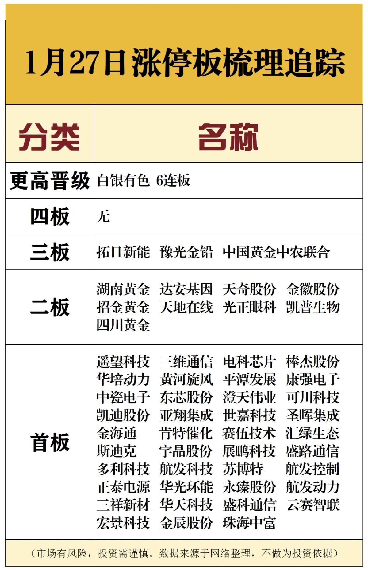1.27周二 涨停板股票:连板高度! 焦点:贵金属,汽车芯片,中芯国际icon概念 涨停板53家,跌停2家 六连板 白银有色 三连板 中国黄金 拓日新能 豫光金铅 四川黄金 中农联合 涨跌比1928:3454