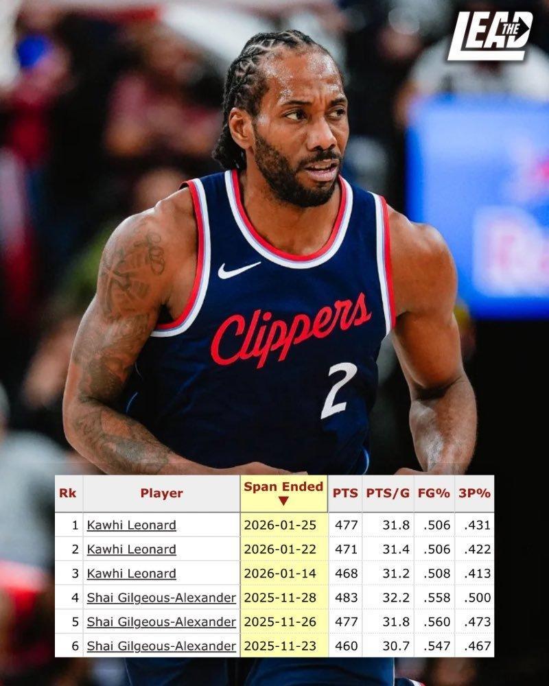伦纳德过去15场比赛的数据表现:场均31.8分、6.7个篮板、2.4次抢断,投篮/三分/罚球命中率为51%/43%/92%,真实命中率66%,正负值累计+160,带队取得13胜2负的战绩。他也成为本赛季继亚历山大之后,唯一一位能在连续15场及以上的比赛中,达成场均30+分且跻身50/40/90俱乐部的球员😳