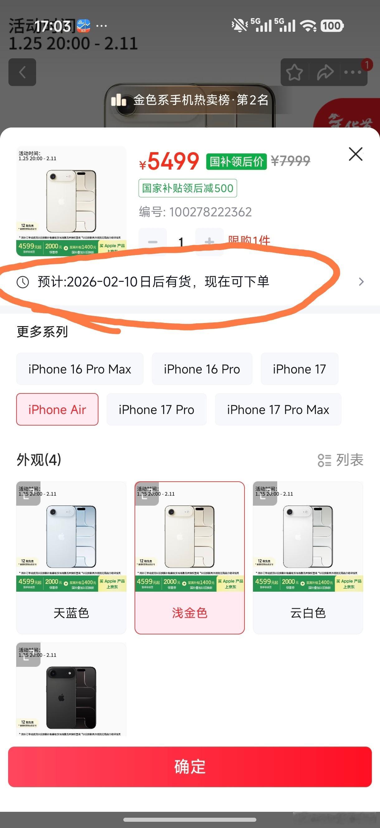 降价2000元iPhoneAir疑为库存机这话题有意思吗JD显示,现在下单,两周之后才有货(2.10有货)