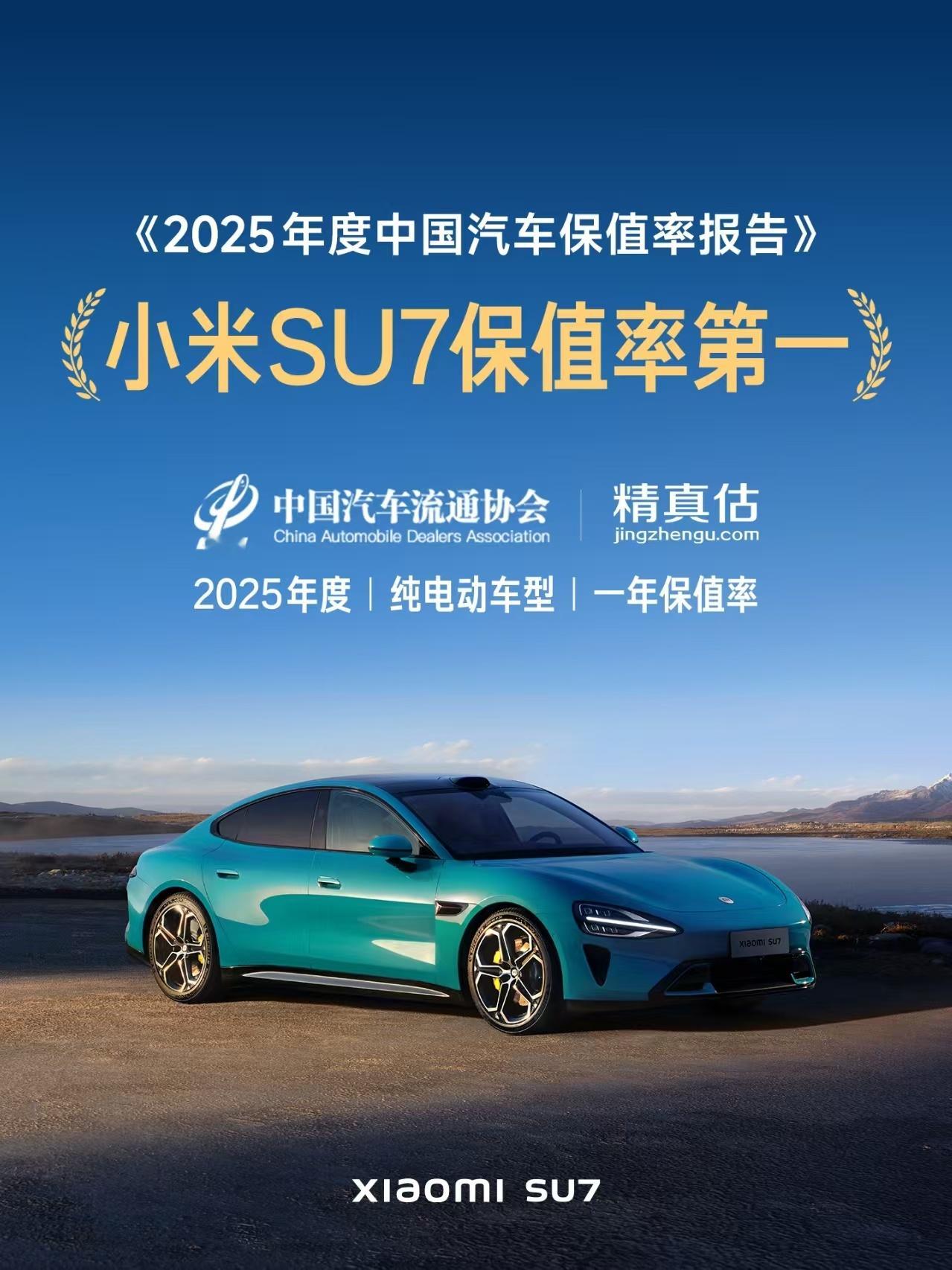 哦吼,由中国汽车流通协会和精真估发布的《2025年度中国汽车保值率报告》,在纯电动车型中,小米SU7「一年保值率」获2025年度第一