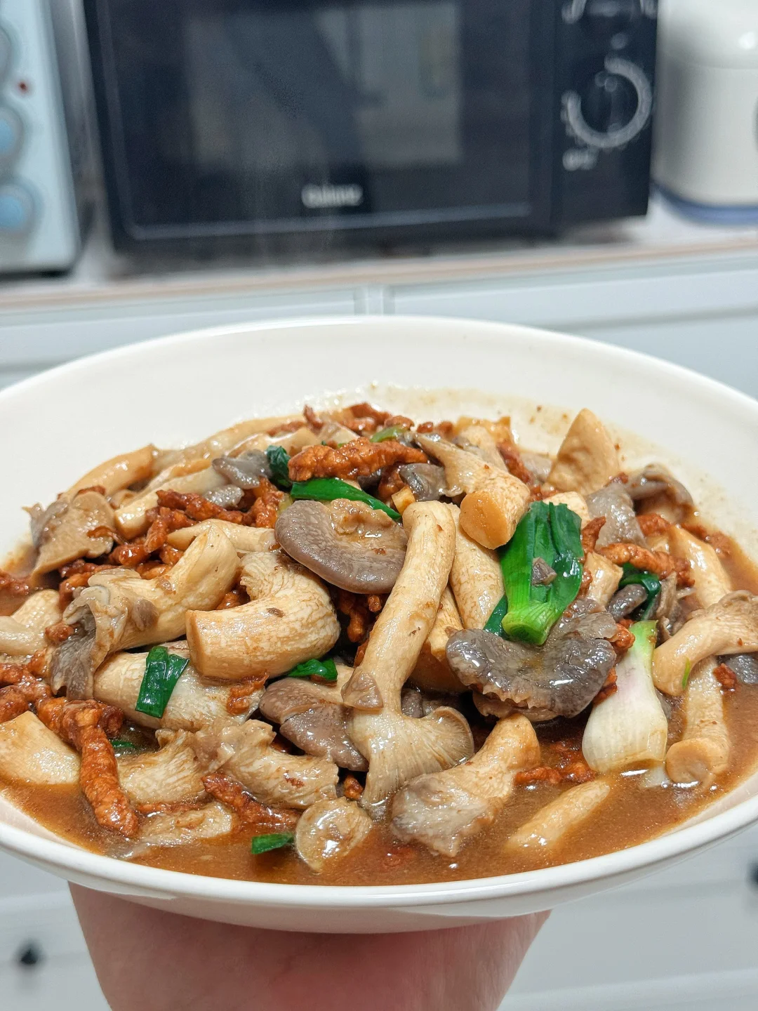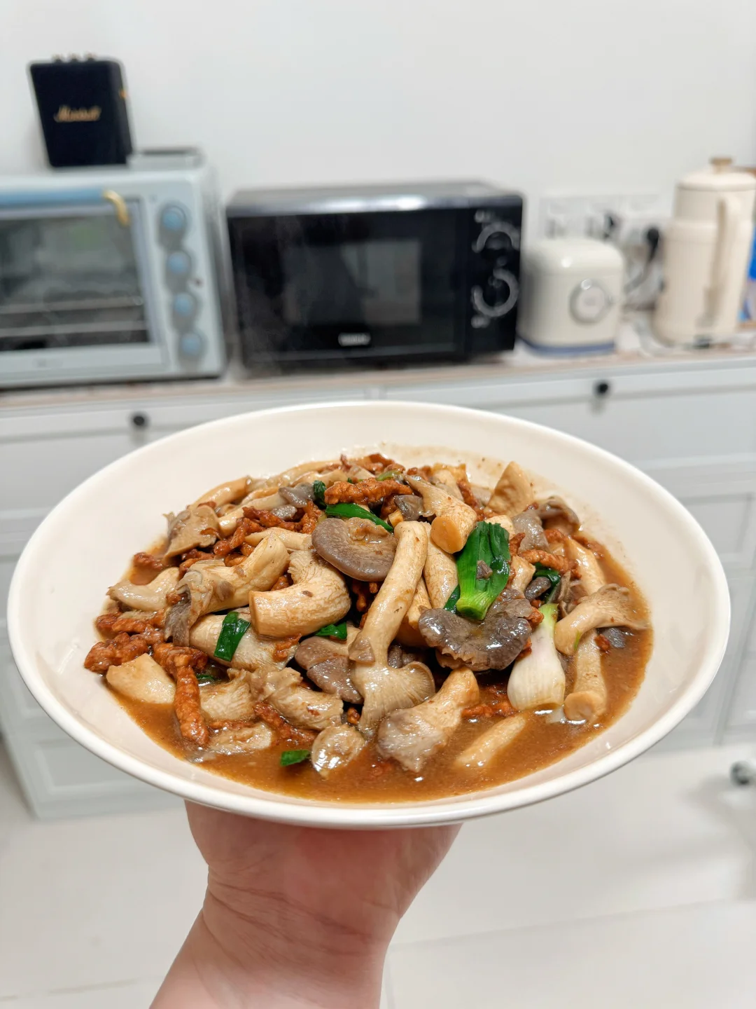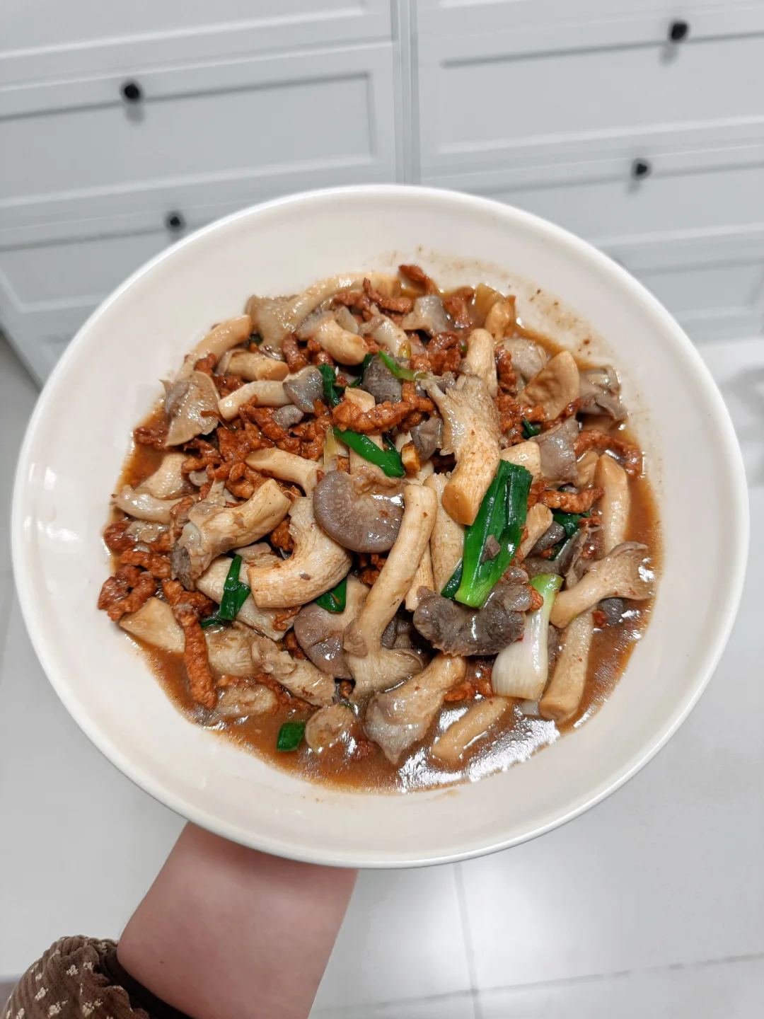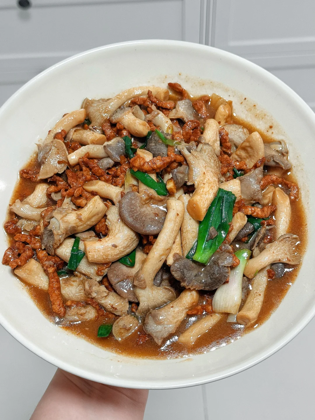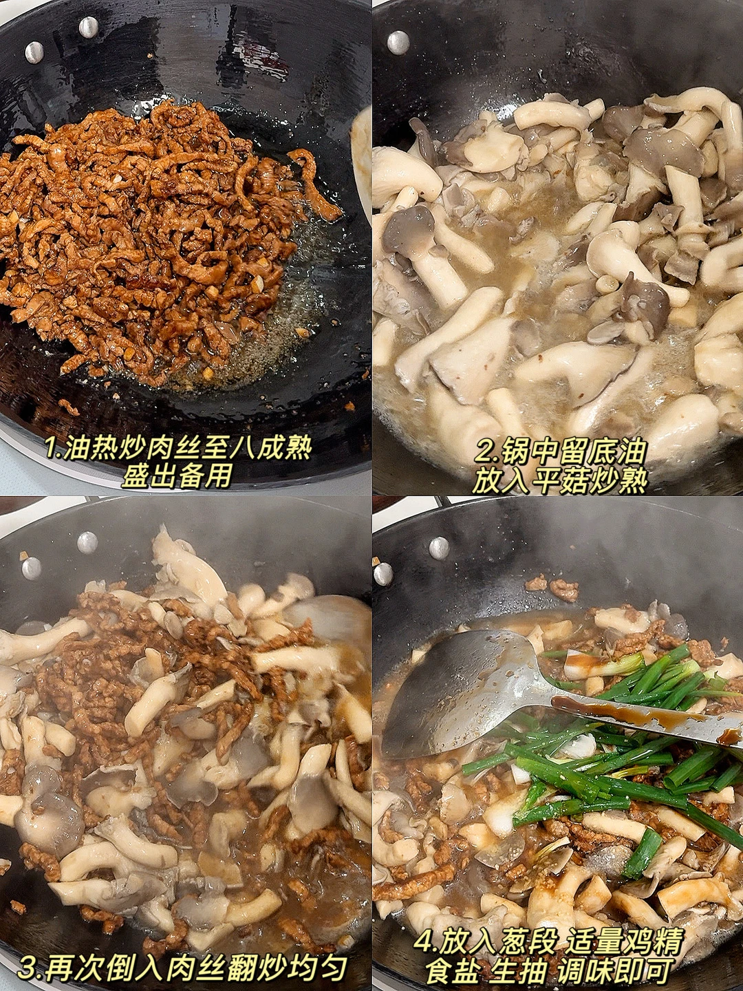 今天做香菇炒肉丝,好吃又下饭,快来试试~ 📜食材:平菇、猪肉丝、葱段 🍳做法: 1⃣️油热炒肉丝至八成熟,盛出备用 2⃣️锅中留底油,放入平菇炒熟 3⃣️倒入肉丝,翻炒均匀 4⃣️放入葱段,适量鸡精、食盐、生抽调味即可。