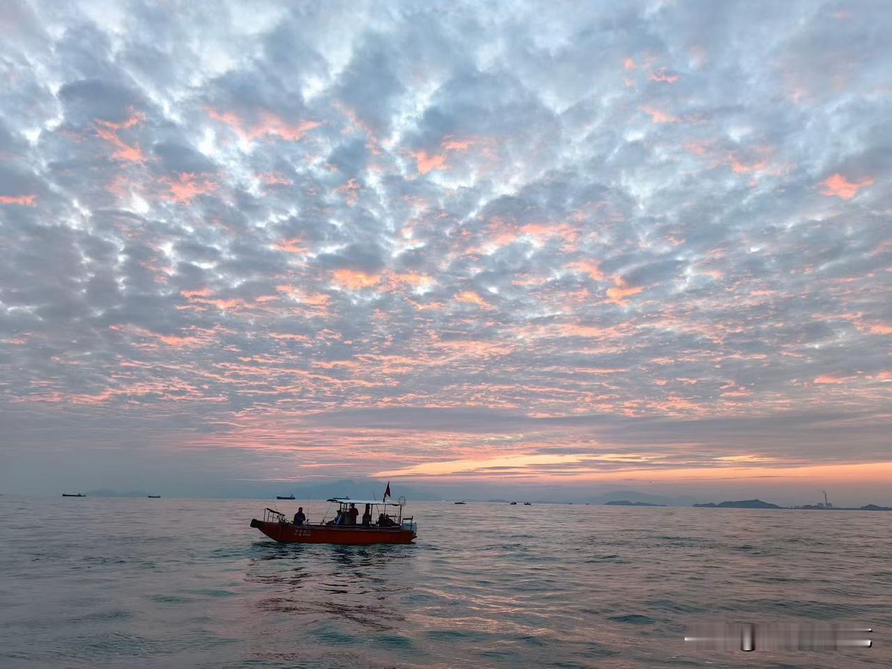 今年冬天的不同粉橙云絮浸在暮色里,海面漾着柔光,红船载着细碎暖意浮在波上。远岸淡成浅影,风裹着咸湿,把黄昏揉成了温柔的诗。