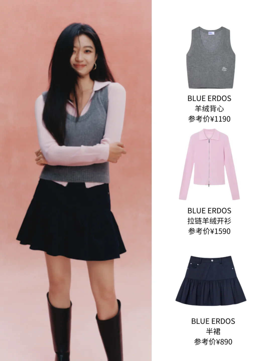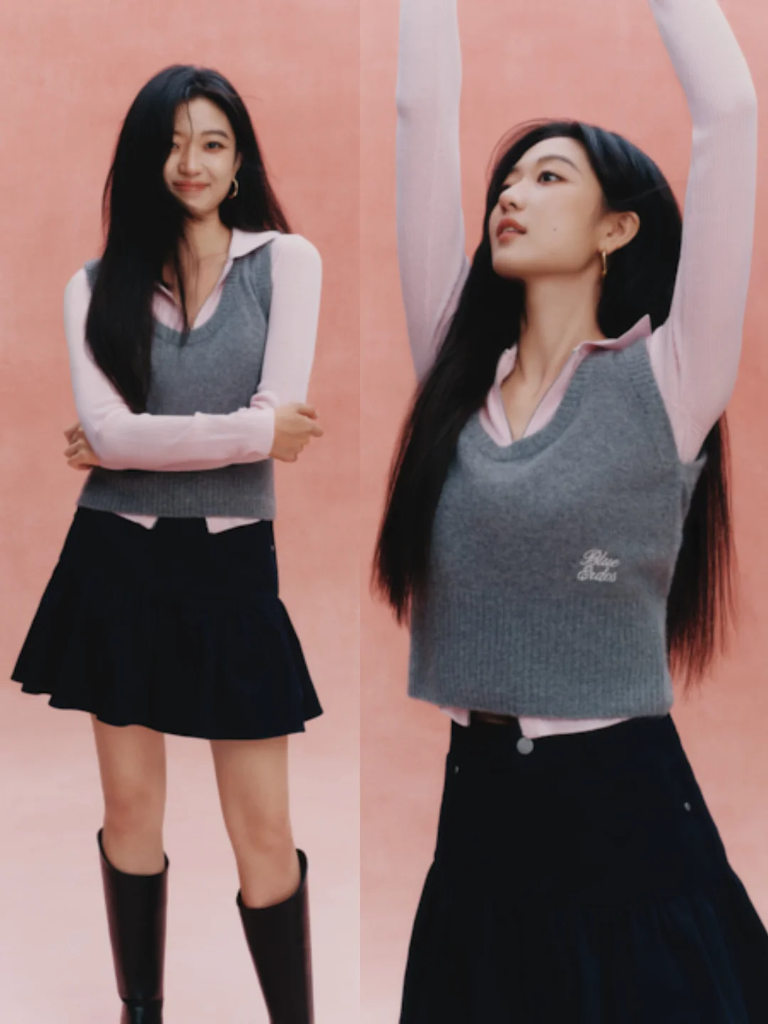 而孙千则解锁了灰粉叠穿高阶玩法,经典灰粉碰撞出利落学院风,同样搭配了蓬蓬裙与长靴,妥妥的甜酷女孩穿搭模板!