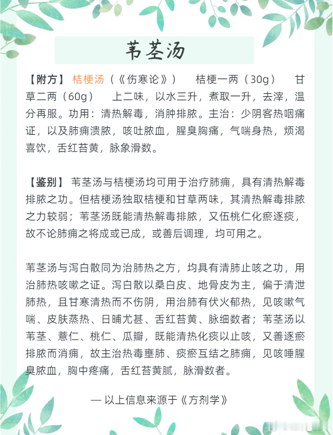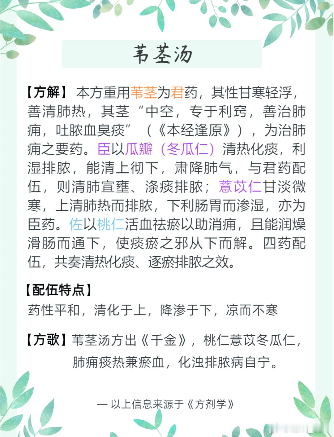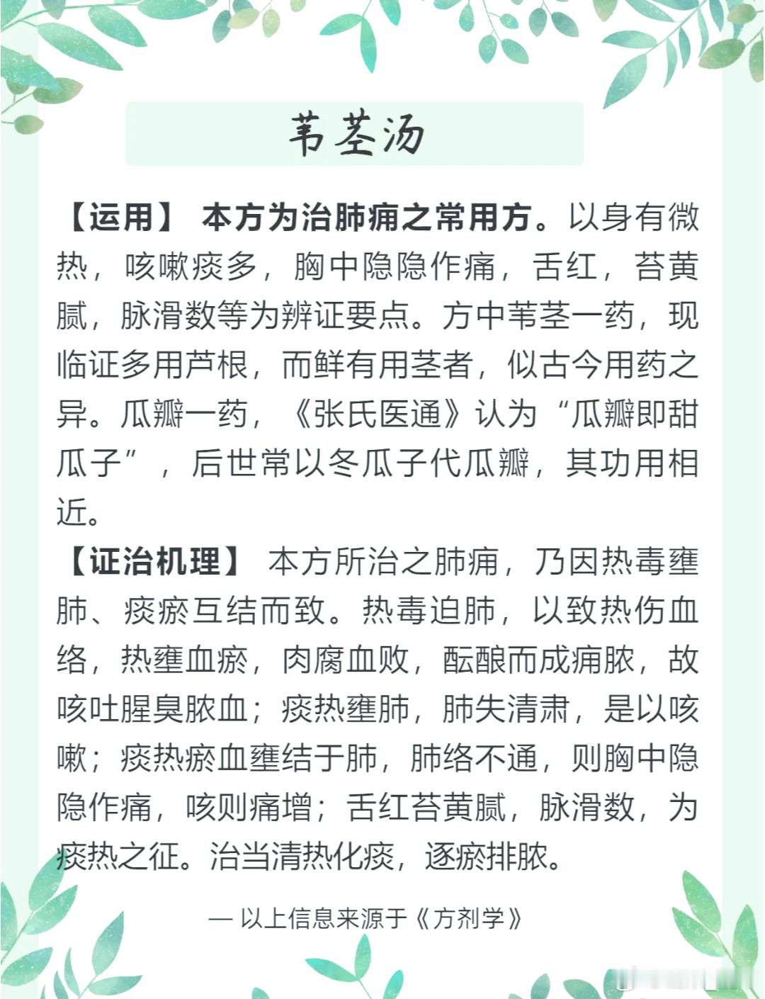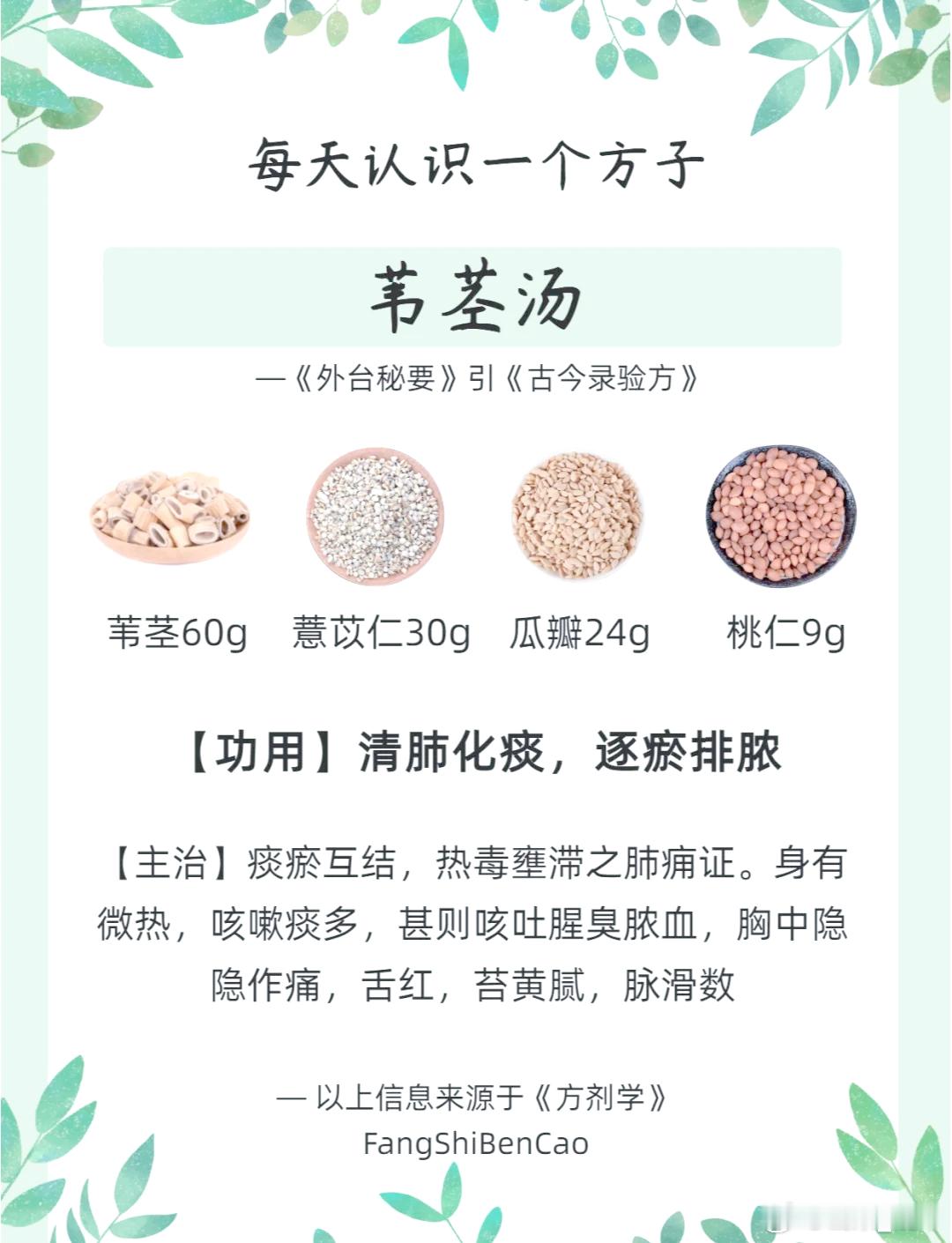 千金苇茎汤,古方清肺化痰!痰多胸闷、肺热咳喘,一碗通肺腑第一道 经典千金苇茎汤食材苇茎30克、薏苡仁20克、冬瓜仁15克、桃仁10克、清水1000毫升制作1. 所有食材洗净,苇茎切段,桃仁捣碎备用。2. 锅中加清水,放入苇茎、桃仁大火烧开,转小火煮20分钟。3. 加入薏苡仁、冬瓜仁,继续煮30分钟,滤渣取汤温饮即可。作用苇茎清肺泄热、生津润燥,薏苡仁利水渗湿、清热排脓,冬瓜仁清热化痰、利湿排脓,桃仁活血化淤。此方为经典古方,专清肺热、化痰排脓,化解肺热壅盛引发的痰多黏稠、胸闷咳喘,疏通肺腑淤滞,让呼吸顺畅。第二道 苇茎雪梨百合汤食材苇茎20克、雪梨1个、干百合15克、冰糖少许、清水800毫升、枸杞5克制作1. 苇茎洗净切段,雪梨去皮去核切滚刀块,百合提前泡发洗净。2. 锅中加清水,放入苇茎大火烧开,转小火煮15分钟,滤去苇茎留汤。3. 苇茎汤中加入雪梨、百合,煮20分钟,加冰糖、枸杞煮5分钟至糖化即可。作用苇茎清肺热、化痰浊,雪梨清肺润燥、生津化痰,百合养阴润肺、清心安神。在古方基础上搭配润养食材,清热不燥,既能清肺化痰、缓解肺热痰多胸闷,又能滋养肺阴,改善肺热久咳导致的咽喉干痒,兼顾清肺与润肺。第三道 苇茎冬瓜仁薏米粥食材苇茎15克、冬瓜仁10克、薏苡仁30克、大米80克、清水适量、冰糖少许制作1. 苇茎、冬瓜仁洗净煮水,大火烧开后小火煮20分钟,滤渣留药汤备用。2. 薏苡仁提前浸泡2小时,大米淘洗干净,一同放入药汤中,加适量清水。3. 大火烧开转小火熬煮30分钟至粥体浓稠,加冰糖调味融化即可。作用苇茎清泻肺热,冬瓜仁、薏苡仁清热化痰、利水排脓,大米健脾和胃。粥品易消化,将古方融入日常饮食,既能清肺化痰、缓解肺热痰多、胸闷不适,又能健脾和胃,避免清肺食材伤脾胃,适合肺热咳喘伴脾胃虚弱者食用。第四道 苇茎莲子瘦肉汤食材苇茎20克、莲子20克、瘦肉200克、生姜2片、精盐少许、清水900毫升制作1. 瘦肉切薄片,冷水下锅加姜片焯水,撇浮沫后温水冲净;苇茎洗净切段,莲子提前泡发去芯。2. 锅中加清水,放入苇茎、莲子、瘦肉、姜片,大火烧开转小火炖40分钟。3. 加少许精盐调味,搅拌均匀即可出锅。作用苇茎清肺热、化痰排脓,莲子补脾止泻、养阴润肺,瘦肉补精益气、滋养身体。汤品清润不腻,在清肺化痰、缓解肺热痰多胸闷、咳喘的同时,补充身体元气,健脾护胃,避免肺热清解过程中耗伤正气,适合肺热咳喘伴体虚乏力者。千金苇茎汤系列食疗方需要特别说明的是,千金苇茎汤是中医经典方剂,属于药物范畴,而非普通食疗,使用时需注意以下关键事项:⚠️ 重要提醒1. 方剂属性与使用前提千金苇茎汤(苇茎、薏苡仁、冬瓜仁、桃仁)出自唐代 《备急千金要方》,是治疗"肺痈"(肺脓疡、支气管扩张等化脓性肺病)的经典方,属于治疗性中药方剂,需在中医师辨证指导下使用。您分享的四个方子中,只有第一道是原方,其余为改良食疗方。2. 辨证使用原则适用证型:仅适用于肺热壅盛、痰热互结证,表现为咳吐黄稠脓痰、胸痛、发热、舌红苔黄腻等禁忌人群:风寒咳嗽、虚寒体质、脾胃虚寒、孕妇、儿童、过敏体质者不宜使用误用风险:若不对证使用,可能损伤脾胃阳气、加重病情3. 关于"苇茎"的现代使用现代药房多用"芦根"(芦苇根)替代古方中的苇茎,两者功效相似但芦根更易获取。若自行购买,建议咨询中药师。关于您分享的四个方子四个方子中,第一道"经典千金苇茎汤"为原方,其余三道是改良的食疗方,药性相对缓和,但仍需辨证使用。具体说明:方名性质适用情况注意事项经典千金苇茎汤治疗性方剂肺热壅盛、咳吐脓痰必须中医师指导,不可自行长期服用苇茎雪梨百合汤食疗改良方肺热咳嗽伴阴伤脾胃虚寒者慎用苇茎冬瓜仁薏米粥食疗改良方肺热痰多伴脾虚孕妇、经期女性慎用苇茎莲子瘦肉汤食疗改良方肺热伴气虚痰湿壅盛者不宜 正确使用建议1. 咨询专业中医师出现痰多胸闷、咳喘等症状时,应先就医明确诊断(排除肺炎、支气管炎、肺结核等器质性疾病),由中医师辨证后决定是否适合使用此方及具体配伍。2. 不可替代正规治疗若确诊为感染性疾病(如细菌性肺炎),需配合抗生素等西医治疗,中药方剂仅作辅助,不可延误病情。3. 食疗方使用要点食疗方相对温和,但仍需判断体质是否适合连续服用不超过3-5天,症状未改善或加重应立即停用儿童、孕妇、慢性病患者需在医生指导下使用常见误区澄清❌ 误区一:"痰多就是肺热,可用此方"痰多原因复杂,风寒、痰湿、气虚、阴虚等均可致痰,需辨证论治。❌ 误区二:"古方安全,可自行调理"古方虽经典,但需精准辨证,现代人体质、环境与古代不同,不可照搬。❌ 误区三:"食疗方无副作用"任何食材、药材都有偏性,长期或不对证使用仍可能伤身。总结:千金苇茎汤是中医经典方,但需严格辨证使用。食疗改良方虽药性缓和,仍建议在了解自身体质或咨询中医师后使用。若确有肺热症状,建议先就医明确诊断,切勿自行长期服用。(注:以上内容为中医科普,不构成医疗建议。如有不适,请及时就医。) 淄博·广成中医