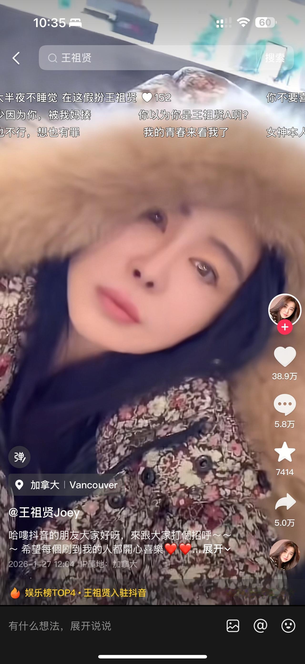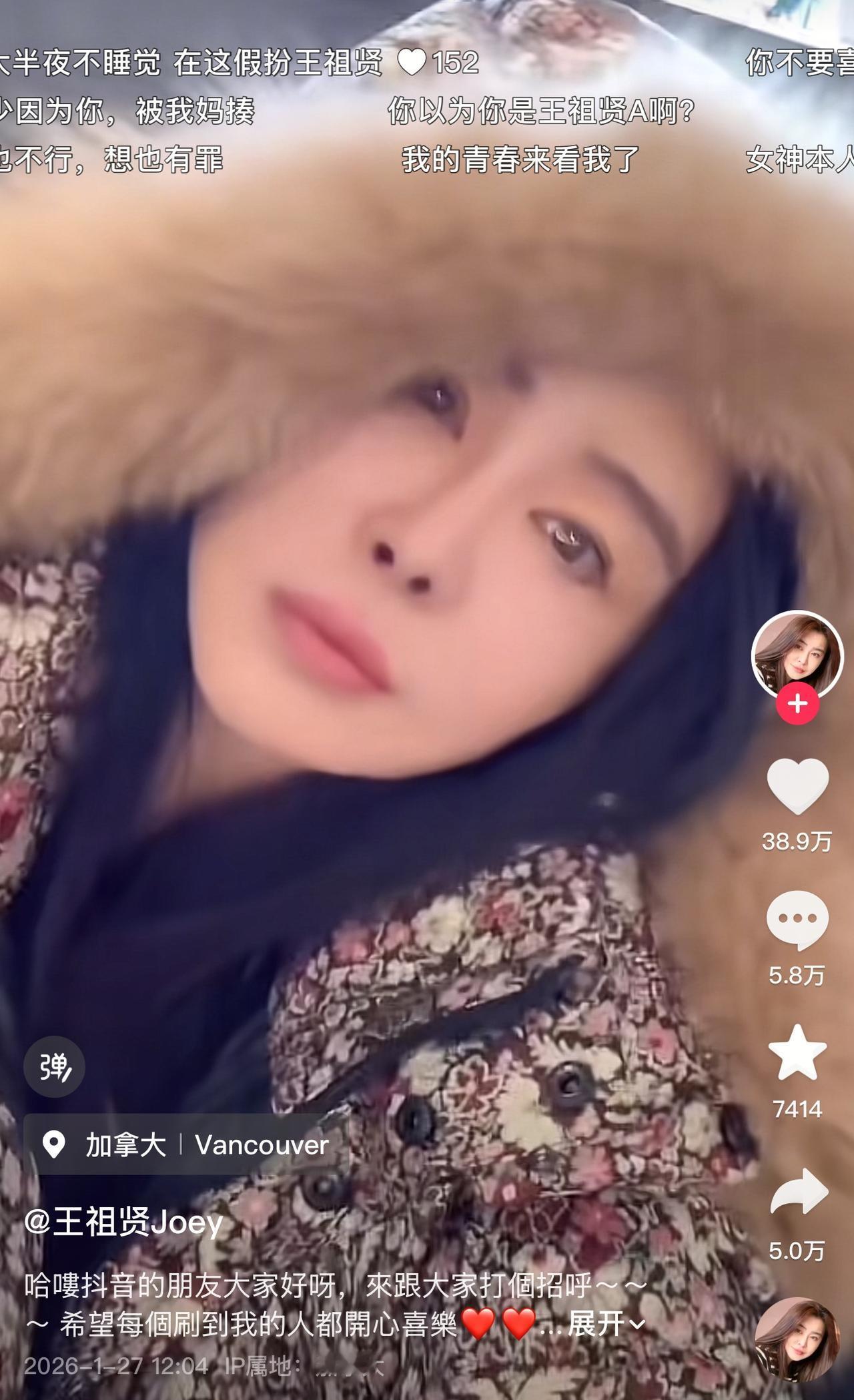女神王祖贤入驻抖音了! 1月27日,远在加拿大的知名演员王祖贤正式入驻抖音,第一