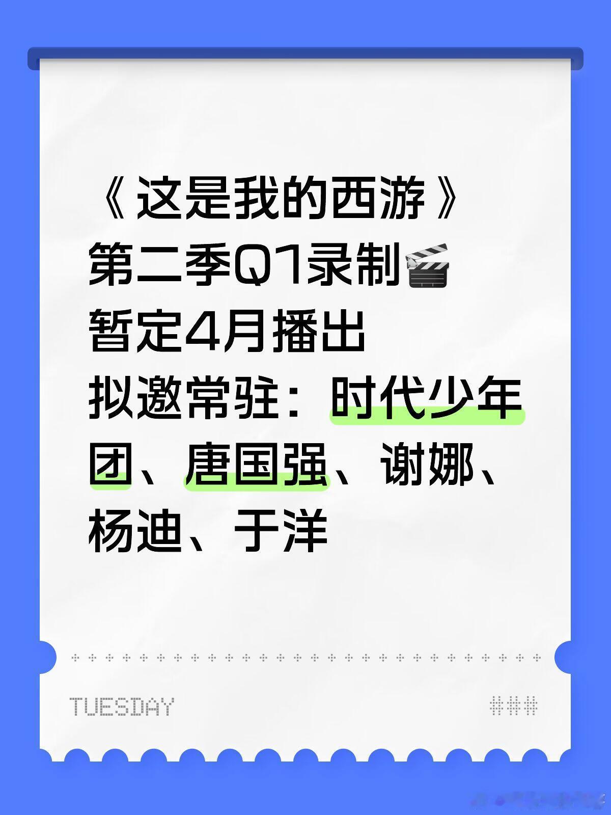 《这是我的西游》第二季第二季Q1录制🎬暂定4月播出拟邀常驻:时代少年团、唐国强、谢娜、杨迪、于洋这是我的西游|