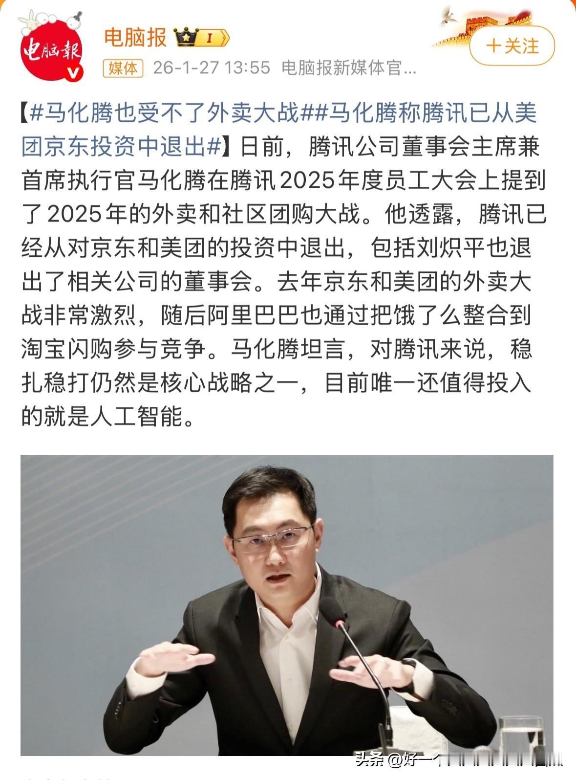腾讯退出外卖大战, 但绝对不会是因为外卖大战太花钱了! 表面上是马化腾受不了外卖大战的烧钱, 其实仔细想想肯定不是这样, 腾讯历来参与进行的烧钱项目并不少, 马化腾也绝对不是烧不起钱的主。 他退出外卖大战最根本的原因还是因为人工智能, 腾讯在人工智能赛道进入得太晚, 而且人工智能赛道比什么外卖大战烧钱得多, 腾讯只可能把资金重点投入到未来最具发展性的赛道上面去, 现在相当于是马化腾把腾讯的未来押宝在人工智能上面了, 他应该会争取后来者居上, 在人工智能这个桌子上争取一个座位。
