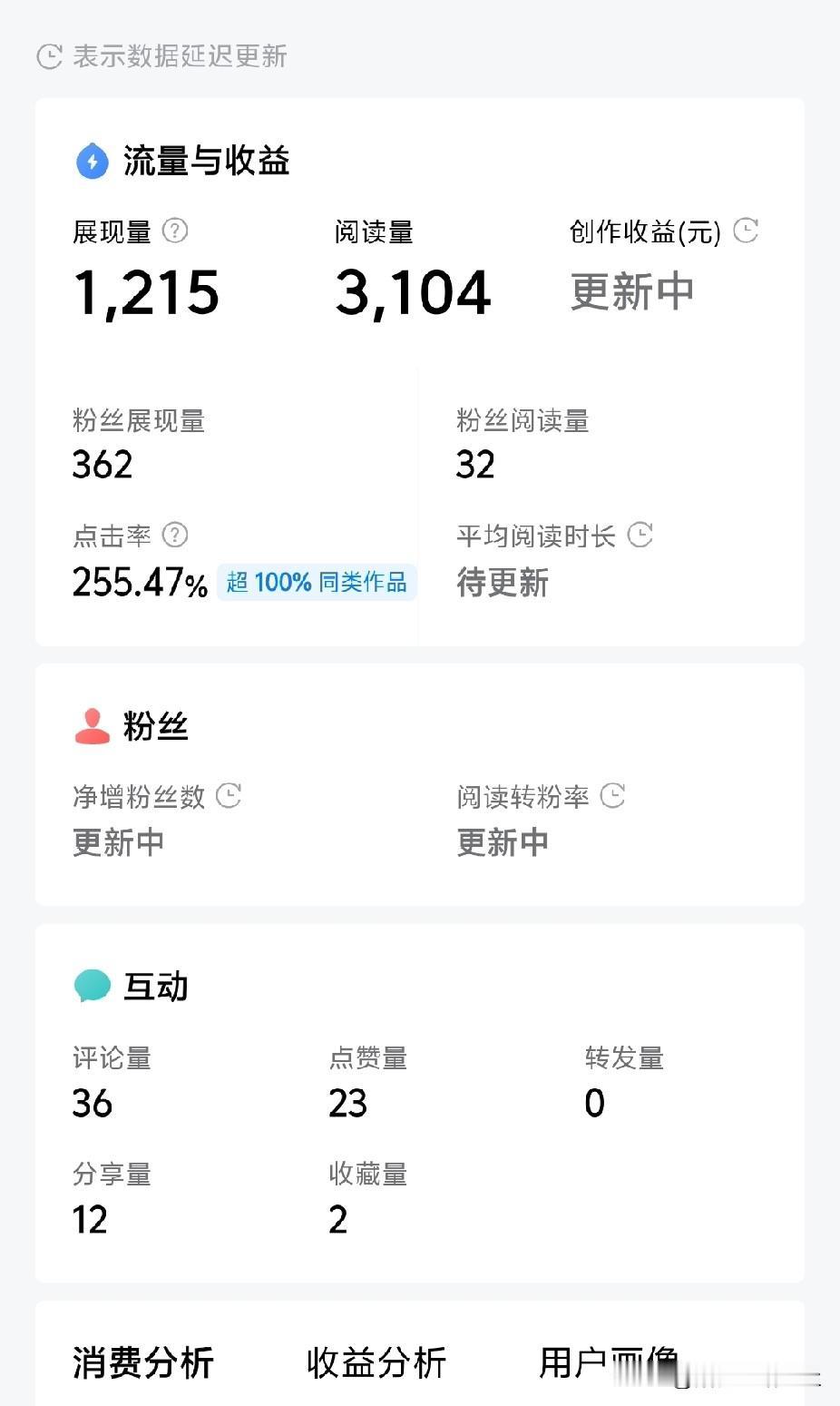 这点击率逆天了,居然达到255.47%! 刚刚才看到,我的“格局真大啊”,这一篇微头条,展现量1215,阅读量达到3104。 应该是数据出错了,这个展现量真的太抠门了!