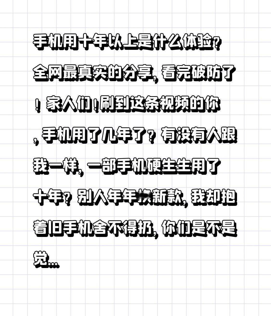手机用十年以上是什么体验?全网最真实的分享,看完破防了! 家人们!刷到这条视频的你,手机用了几年了?有没有人跟我一样,一部手机硬生生用了十年?别人年年换新款,我却抱着旧手机舍不得扔,你们是不是觉得我抠门?今天就跟大家掏心窝子聊聊,手机用十年以上,到底是种什么神仙体验! 一开始用这部手机的时候,它还是当年的旗舰机,拍照清晰、运行丝滑,拿在手里倍儿有面子。那时候刷视频、打游戏、聊微信,样样都顺手,我还跟朋友炫耀:“这手机质量真好,能用好几年!”可谁能想到,这一用就是十年。后来手机慢慢变卡了,打开个微信要等半分钟,拍个照糊得像马赛克,电池更是一天充八遍,出门必带充电宝。身边人都劝我换:“都啥年代了,还用这种老古董!”“手机卡成这样,不耽误事吗?”说实话,那时候真的有点尴尬,尤其是聚会的时候,别人掏出新款手机咔咔拍照,我只能默默揣起我的旧手机。 但这里有个暖心的转折——手机用久了,早就不是一个冷冰冰的工具,而是成了藏满回忆的老伙计!十年里,它陪我熬过了无数个加班的深夜,存着我和家人的第一张合照,记着我刚毕业时找工作的辛酸,还有和朋友一起旅行的点点滴滴。我试过把数据导到新手机上,可翻着那些旧照片、旧聊天记录,突然就舍不得了。而且用久了的手机,按键的触感、屏幕的亮度,甚至是轻微的划痕,都成了最顺手的习惯。更重要的是,一部手机用十年,省下的钱能给爸妈买好几件新衣服,能给孩子报一个兴趣班,这笔账算下来,别提多踏实了! 现在我的手机依然在服役,虽然它很卡、很旧,但我还是舍不得换。它就像一个老朋友,见证了我十年的喜怒哀乐,陪我走过了人生中最珍贵的一段时光。 你有没有一部舍不得换的旧手机?它藏着你哪些难忘的回忆?评论区分享出来吧!关注我,下期咱们聊聊那些年我们用过的经典手机,你还记得几款!