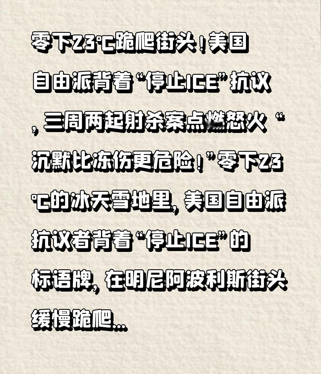 零下23℃跪爬街头!美国自由派背着“停止ICE”抗议,三周两起射杀案点燃怒火 “沉默比冻伤更危险!”零下23℃的冰天雪地里,美国自由派抗议者背着“停止ICE”的标语牌,在明尼阿波利斯街头缓慢跪爬,冻得通红的双手死死抓住地面,身后是数万名高呼口号的示威人群——这震撼一幕的背后,是三周内两起联邦执法射杀案,是被激化的民权危机,更是美国社会撕裂的缩影。 事情的导火索,是两场疑点重重的执法枪击。1月7日,37岁的美国公民蕾恩·妮科尔·古德在车内被移民与海关执法局(ICE)特工射杀,国土安全部声称她“企图开车冲撞执法人员”;可仅仅17天后,37岁的急诊室护士亚历克斯·普雷蒂又遭ICE枪杀,官方理由是“他持枪暴力反抗”。但社交媒体流传的视频却戳破了谎言:普雷蒂被7名蒙面特工围堵跪压,已失去抵抗能力,执法人员仍在5秒内连开10枪,甚至没有按规定进行急救,而是当场清点射击次数。 接连两名合法公民丧生,彻底点燃了民众的怒火。自由派抗议者选择用“跪爬”这种极端方式发声:他们背着写有“停止ICE”“正义何在”的标语,在积雪覆盖的街道上匍匐前行,用身体控诉执法暴力。有人膝盖磨破渗血,有人冻得嘴唇发紫,却始终高喊“没有正义就没有和平”。这场抗议迅速蔓延,5万民众冒着严寒走上街头,数百家商户响应“罢市”,机场抗议者呼吁航空公司拒绝运送ICE拘留者,连前总统克林顿、奥巴马都罕见发声,谴责执法过度与政府失职。 但反转来了:局势越紧张,官方的操作越荒诞。为了避免“ice(冰)”的缩写引发民众对执法机构的联想,美国气象部门竟要求预报员禁用“结冰”一词,改用“冻雨”替代,生怕防灾预警被转化为抗议素材。这种“掩耳盗铃”的做法引发强烈反弹,有内部人士吐槽:“为了政治避嫌放弃精准预警,只会让民众更危险。”而更讽刺的是,ICE执法人员享有“有条件豁免权”,即便涉嫌过度使用武力,也极少被起诉,两场射杀案的涉事特工至今仍未被追究刑责。 抗议背后,是更深层的社会危机。三千名ICE特工近期涌入明尼阿波利斯,重点针对拉丁裔和索马里裔社区,导致有色人种人人自危——有人睡觉都随身携带护照,有人逛超市不敢离身出生证明。公交司机拒绝让ICE特工上车,学校工会通过条款禁止执法人员进校园,社区自发组建互助网络,代购食品、提供房租支持,曾经的邻里信任正在被恐惧撕裂。当地餐厅老板坦言:“员工哪怕有合法身份,也害怕出门,生意锐减只能缩短营业时间。” 这场跪爬抗议,早已超越了对单一事件的不满。自由派用身体力行的抗争,质问着美国的“民主底线”:当执法机构可以随意射杀公民却不受追责,当少数族裔的安全得不到保障,当政府为了维稳不惜篡改天气预报,这样的社会还能称之为“自由之地”吗?明尼阿波利斯市长的怒吼道出了民众心声:“还需要多少美国人死亡,才能让这种暴力执法停止?” 抗议仍在继续,严寒与怒火交织。那些在雪地里跪爬的身影,不仅是在为逝去的生命呐喊,更是在为一个公平正义的社会抗争。愿这场寒冬里的坚守能换来改变,愿执法暴力不再重演,愿每个公民的生命权都能得到尊重。你如何看待美国的这场民权抗议?评论区聊聊你的看法~