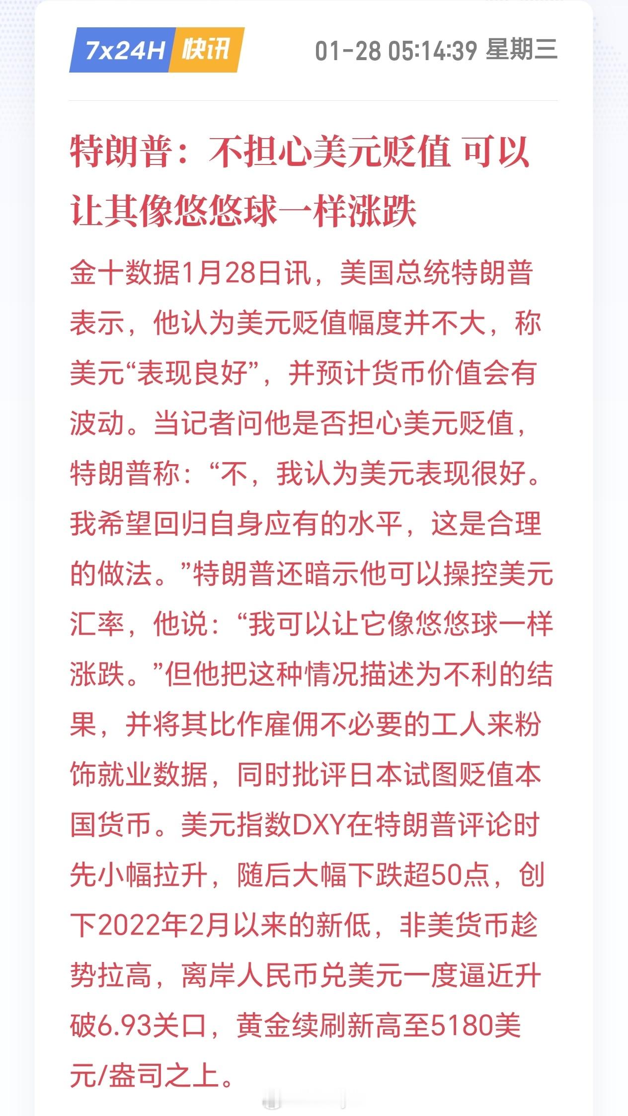 特朗普不担心美元贬值,暗示他可以操控美元汇率,他说:“我可以让它像悠悠球一样涨跌。”
