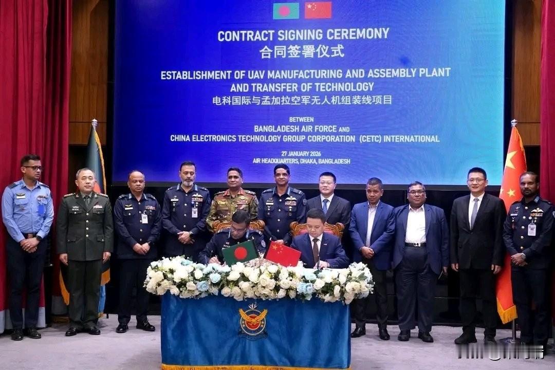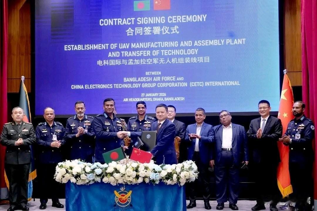 孟加拉国空军借助中国无人机制造厂加强国产无人机能力 孟加拉国空军 (BAF) 与中国电子科技集团有限公司 (CETC International) 签署了一项具有里程碑意义的政府间协议 (G2G),将在孟加拉国建立最先进的无人机 (UAV) 制造和组装厂,其中包括全面的技术转让(ToT) 。 该协议于2026年1月27日在空军总部签署,旨在实现中空长航时(MALE)和垂直起降(VTOL)无人机的本地化生产,增强国家在无人系统领域的自主能力,并培养一支技术精湛的航空航天人才队伍。这些无人机将用于支持军事行动以及人道主义救援和灾害应对任务。 空军参谋长哈桑·马哈茂德·汗空军上将、高级文职和军事官员以及中国驻孟加拉国大使出席了签字仪式,这体现了该伙伴关系的战略重要性。